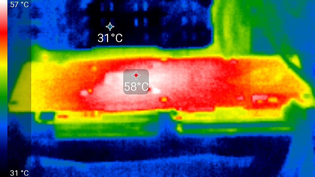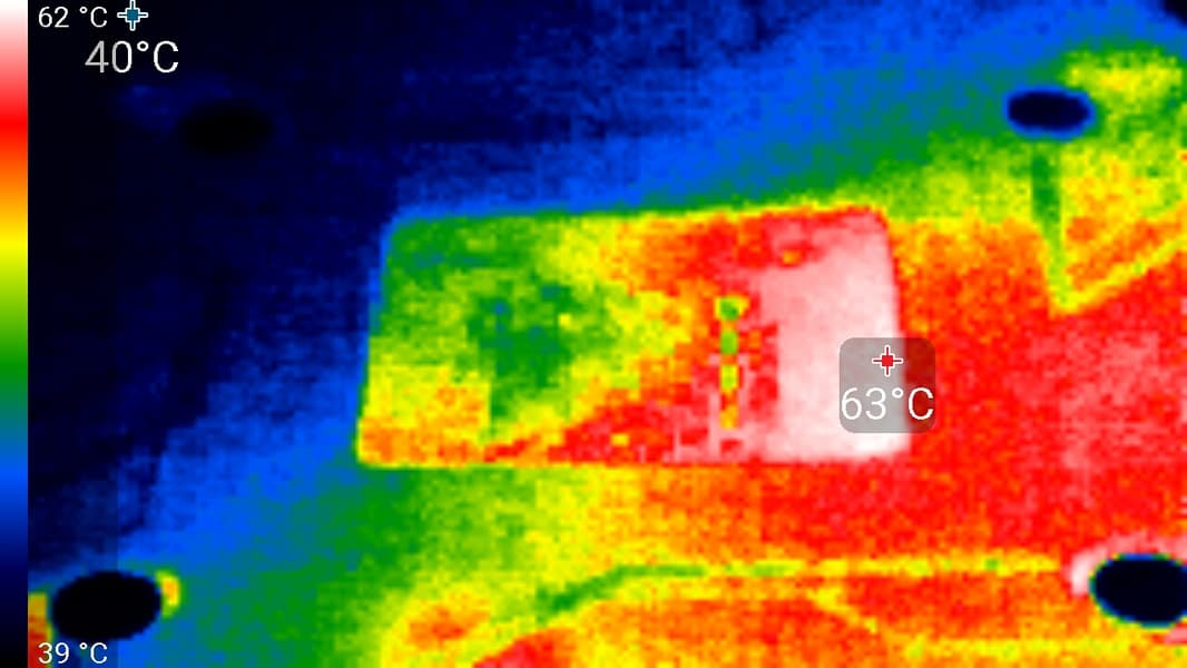 Максимальный нагрев — центральный участок PCB около GPU и силовых преобразователей.