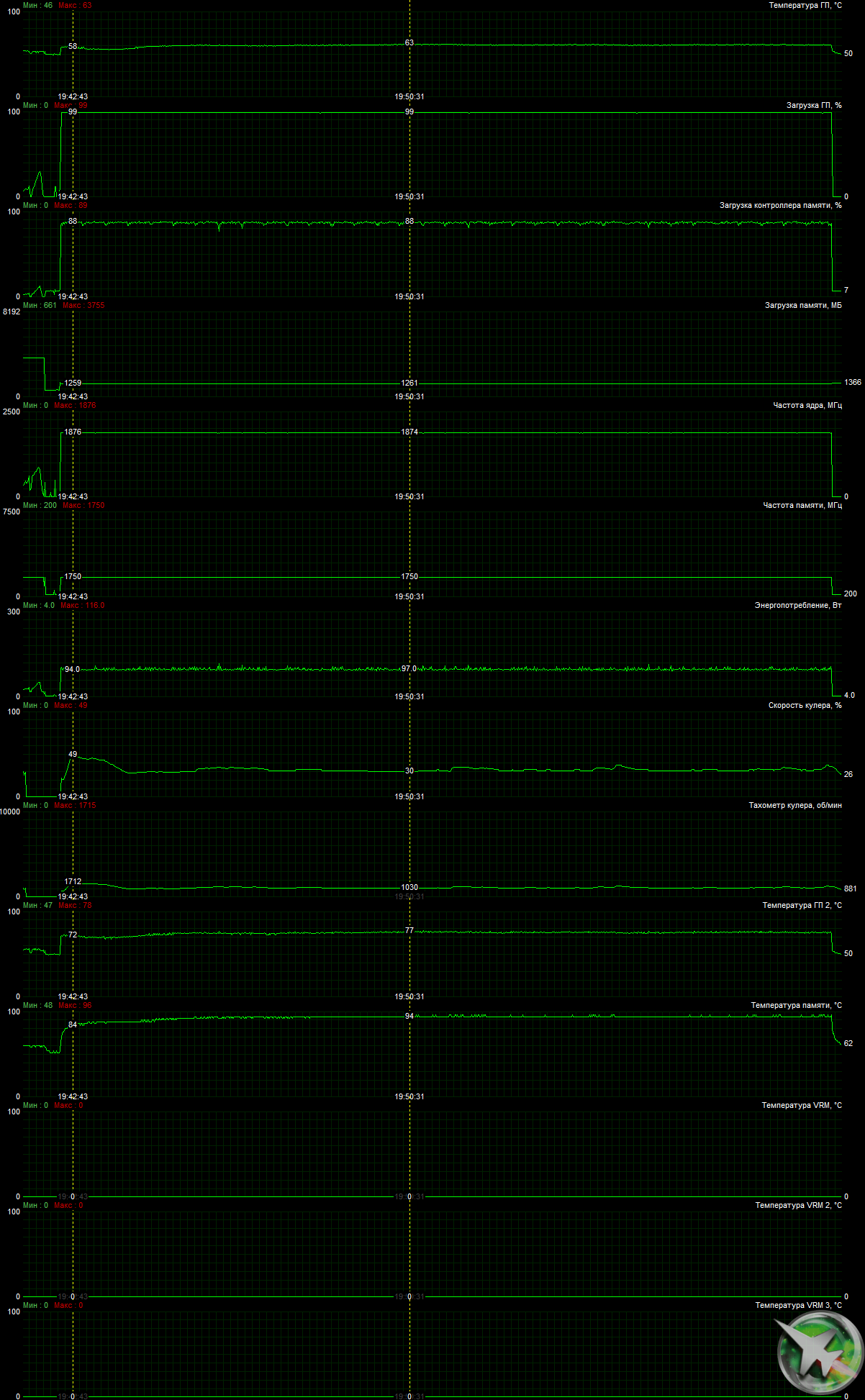 После 6-часового прогона под нагрузкой максимальная температура ядра не превысила 63 градусов, что является отличным результатом для видеокарты такого уровня.