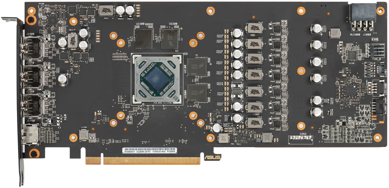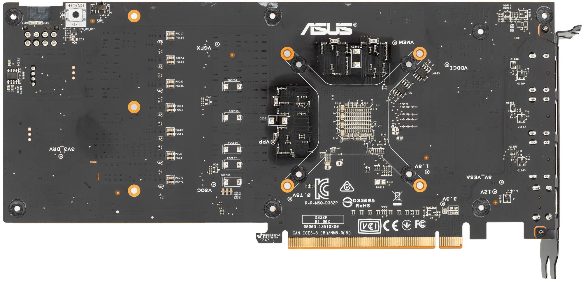 У карты Asus обычный набор видеовыходов: три DisplayPort и один HDMI. Питание подается через один 8-контактный разъем, который имеет световой индикатор корректности подключения: если все правильно, то должен гореть белый светодиод, который переключается на красный в случае проблем.