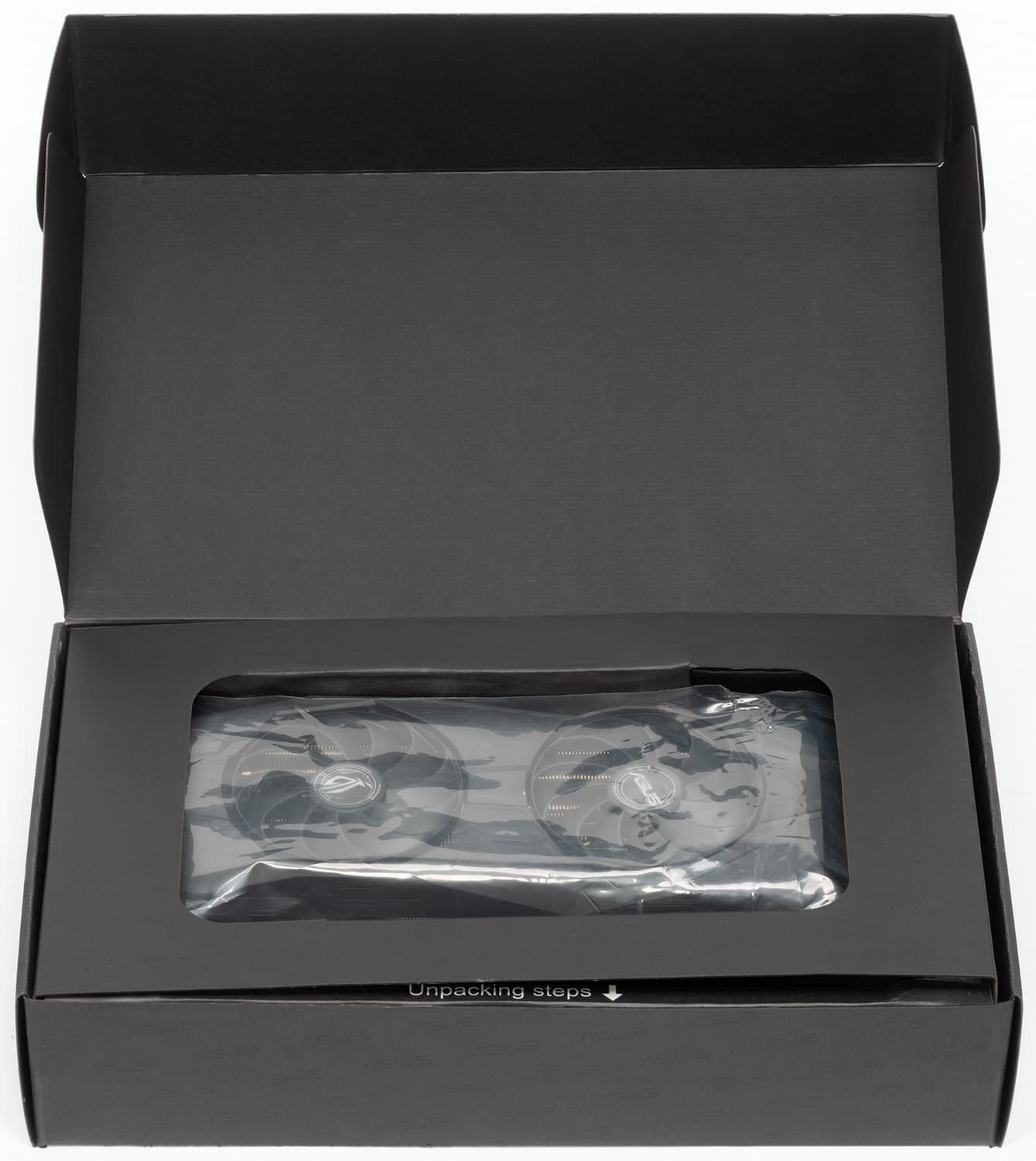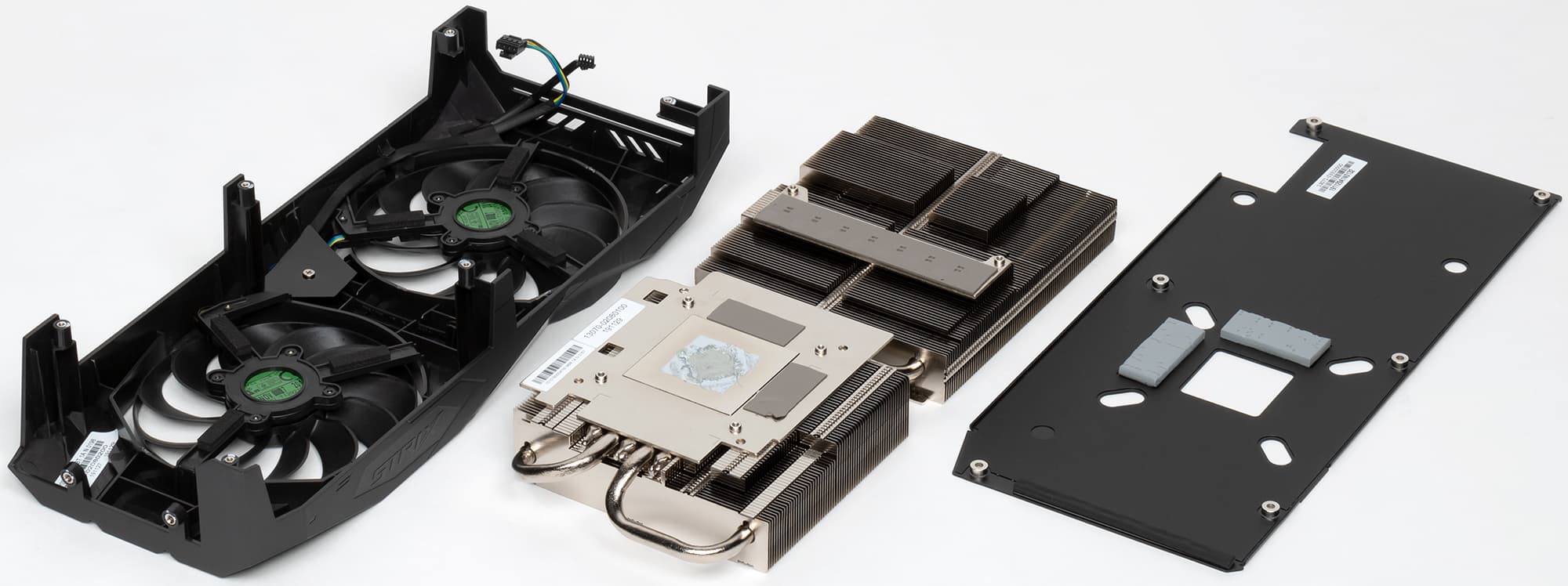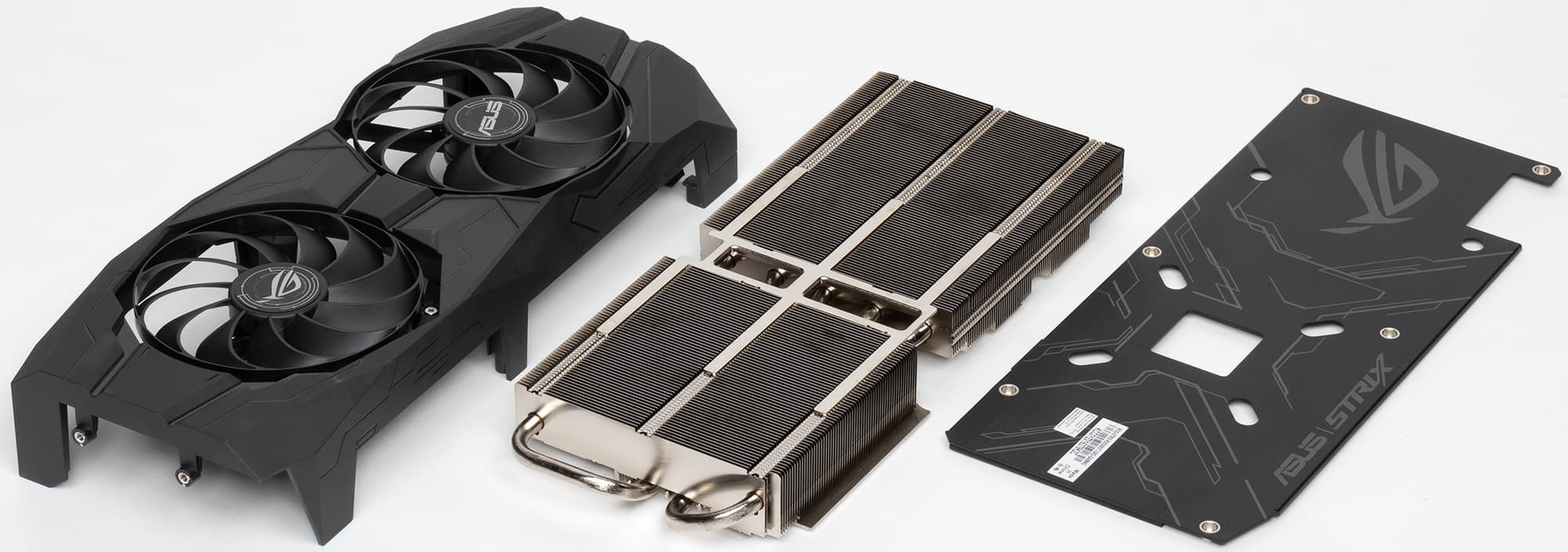 Как во всех СО серии Strix, основным элементом является сдвоенный пластинчатый никелированный радиатор. Обе части радиатора соединены тепловыми трубками, разносящими тепло по ребрам. Микросхемы памяти (через термоинтерфейс) охлаждаются той же большой подошвой, которая прижимается к GPU. Для силовых элементов имеется своя небольшая подошва с термоинтерфейсом на второй части радиатора. На обороте карты установлена толстая пластина, служащая не только элементом жесткости для массивной карты, но и охладителем PCB.