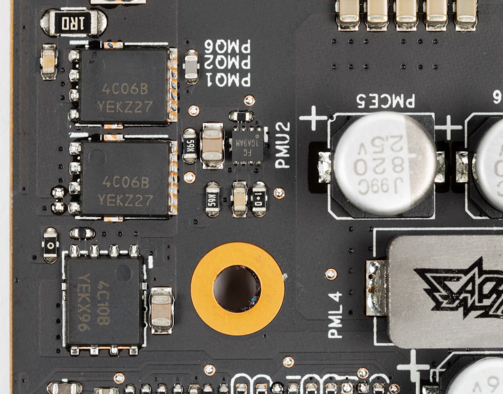 Отлично видно, что разводка печатных плат сильно отличается. И разница отнюдь не ограничивается конвертером питания, в сравнении с картой Asus модель Sapphire — простая, как... ну, не как «валенок», конечно, но все равно проще не бывает, если мы говорим о RX 5500 XT в целом.