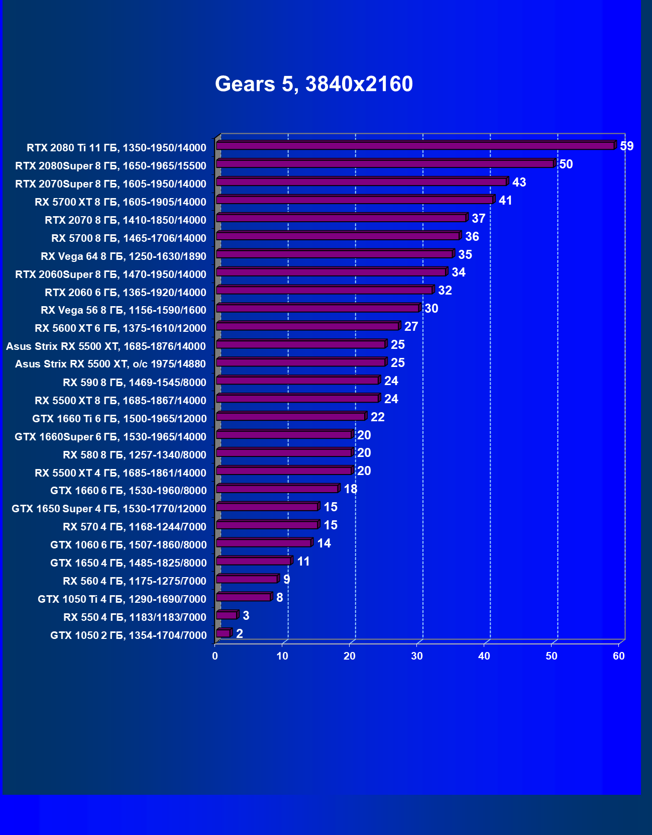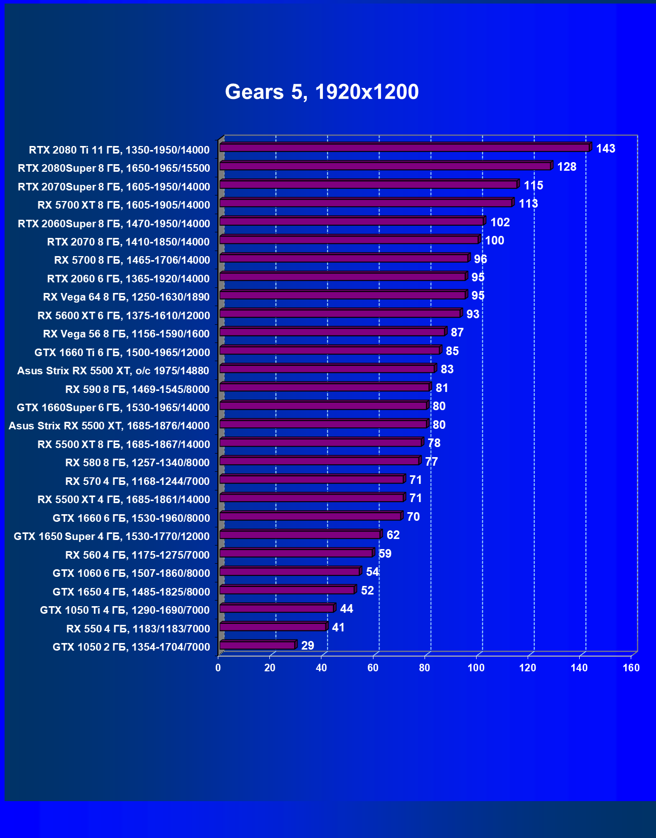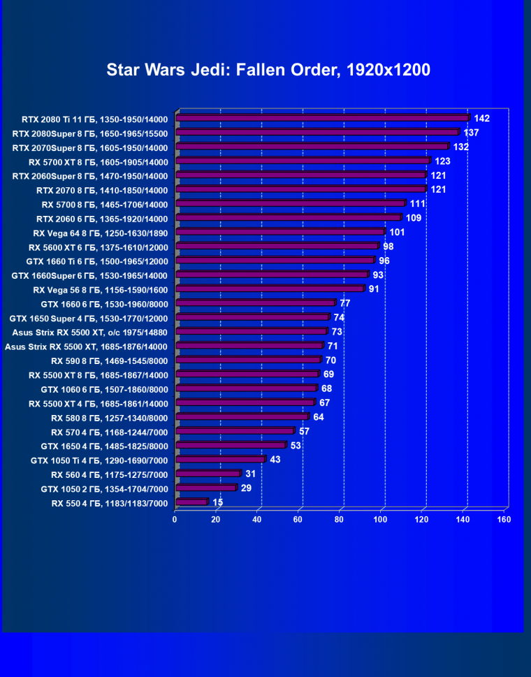 | 17 | Asus Strix RX 5500 XT, 1685—1876/14000 | 580 | 283 | 20 500 |
