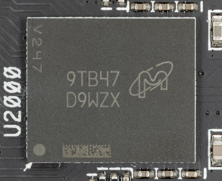 Карта имеет 8 ГБ памяти GDDR6 SDRAM, размещенной в 4 микросхемах по 16 Гбит на лицевой стороне PCB. Микросхемы памяти Micron (GDDR6, MT61K512M32KPA-14:B) рассчитаны на номинальную частоту работы в 3500 (14000) МГц. Расшифровщик кодов на упаковках FBGA находится здесь.