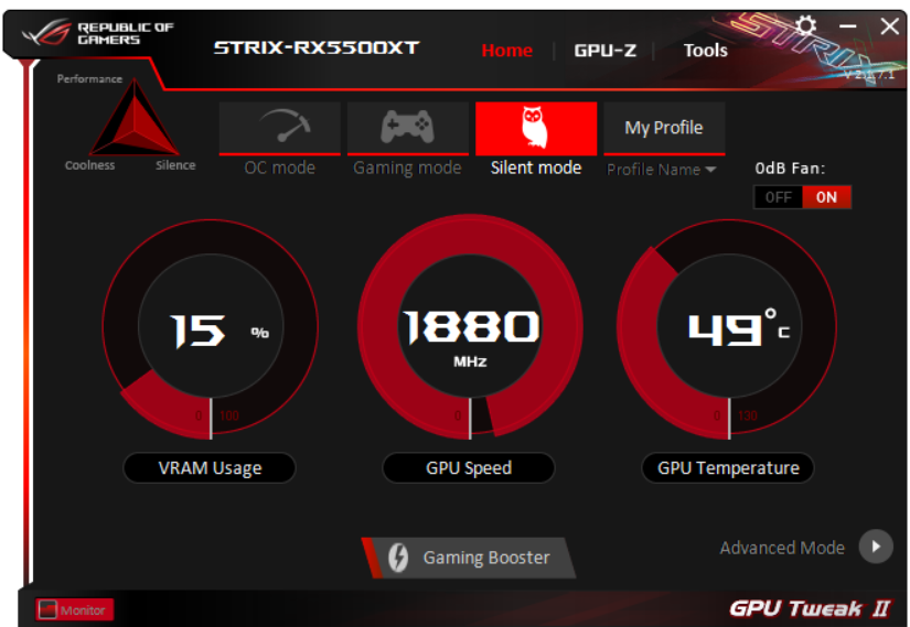 Кулер останавливает вентиляторы, если температура GPU опускается ниже 55 градусов. Разумеется, СО при этом становится бесшумной. При запуске ПК вентиляторы работают, затем останавливаются, загрузка видеодрайвера снова заставляет вентиляторы крутиться на 1-2 секунды (пока идет опрос рабочей температуры), и они выключаются (это видно в ролике ниже).