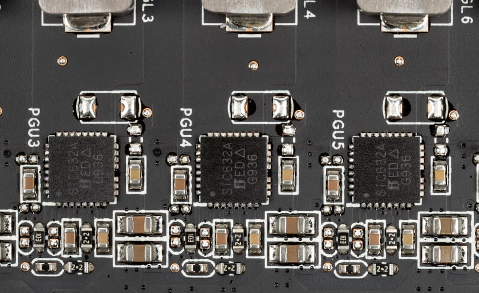 Возможностей данного контроллера, по всей видимости, достаточно для честного управления фазами питания. В результате имеем 7 сборок типа DrMOS — Vishay Intertechnology SiC632A (до 50 А каждая). Традиционно для Asus, система питания исполнена по технологии Super Alloy Power II, в ней использованы современные твердотельные конденсаторы.