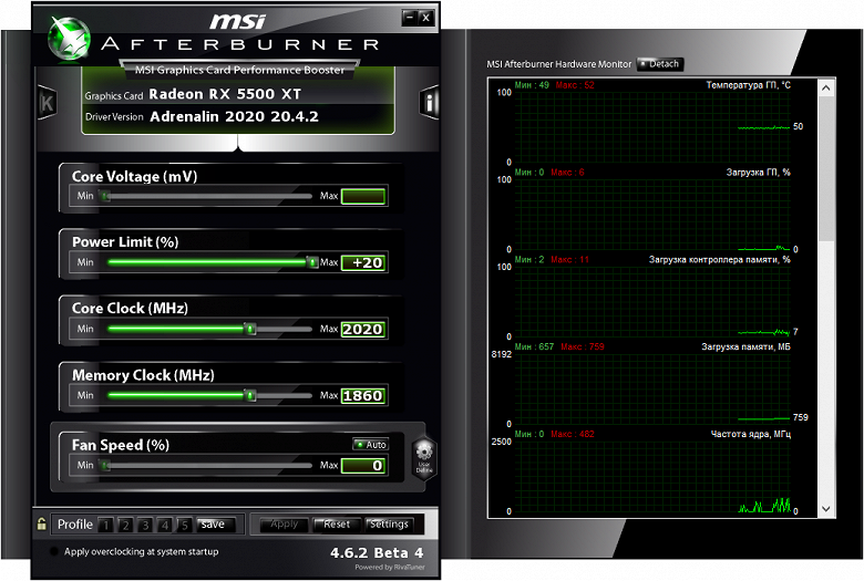Однако частота памяти сразу же сбрасывалась до 1860 (14 880) МГц, а фактический максимум по частоте ядра составил 1976 МГц (вместо выставленных 2020 МГц). При этом лимит потребления был поднят на 20%, но это, увы, не помогло. Это надо учитывать всем, кто любит разгонять видеокарты: у семейства AMD Radeon RX 5000 выставленная максимальная частота ядра практически никогда не достигается.