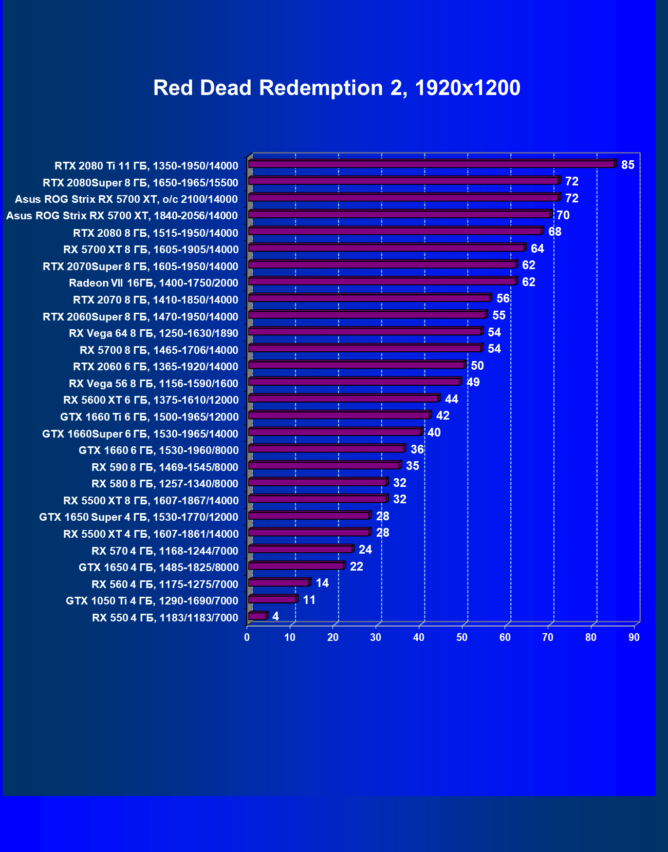 | 07 | Asus ROG Strix RX 5700 XT, 1840—2056/14000 | 385 | 1195 | 31 000 |