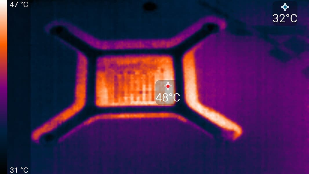В режиме максимальной нагрузки в 3D температура в Performance Mode достигала 59 °C. Вентиляторы при этом раскручивались до 1950 оборотов в минуту, шум вырастал до 29,9 дБА: это еще тихо. В видеоролике ниже шум фиксировался на пару секунд через каждые 30 секунд.