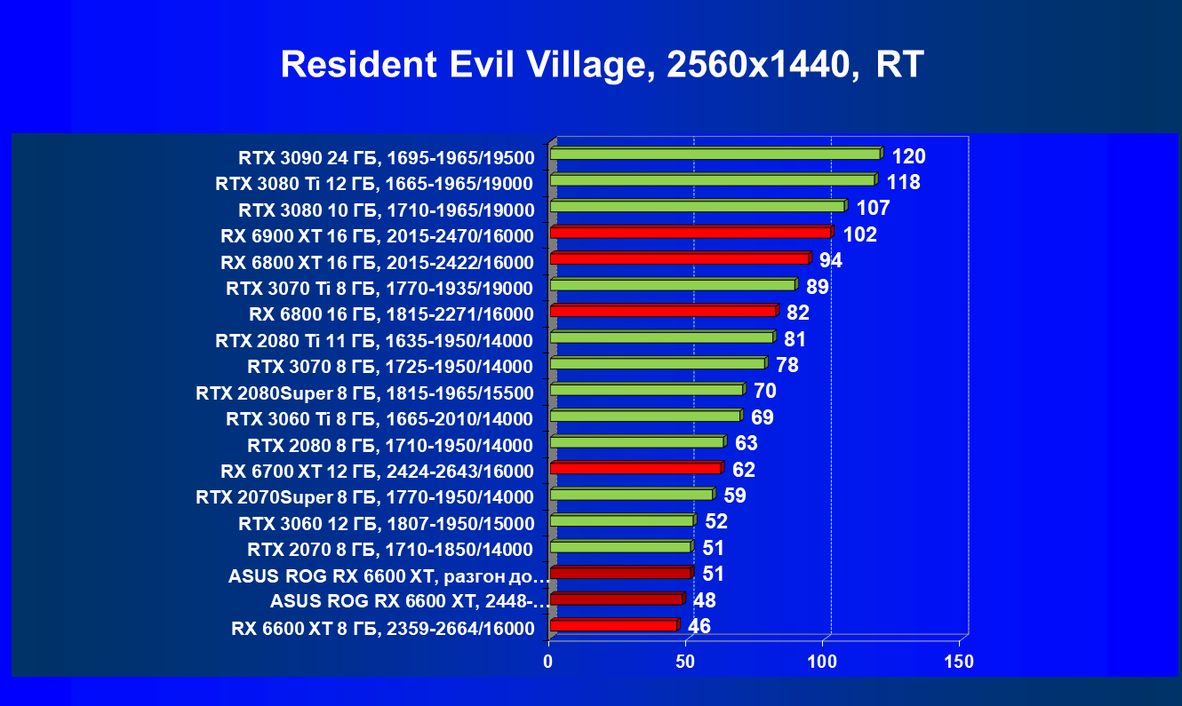 Как у всех видеокарт на базе семейства графических процессоров последнего поколения RX 6000, мы наблюдаем очень сильное падение производительности в играх с RT. Разумеется, падение скорости есть и у конкурентов из стана Nvidia, но там оно не такое сильное, как у Radeon. Поэтому если мы говорим об RX 6600 XT, то во многих играх придется понижать настройки графики, чтобы при использовании RT получить приемлемый комфорт, и это даже в Full HD, не говоря о более высоком разрешении. Впрочем, есть игры, где и с трассировкой лучей 6600 XT показывает неплохую скорость в том же Full HD.