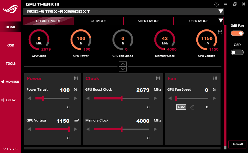 В простое режимы Performance Mode и Quiet Mode совершенно не отличались: в 2D температура была не выше 39 °C, вентиляторы не работали, уровень шума был равен фоновому — 18 дБА.