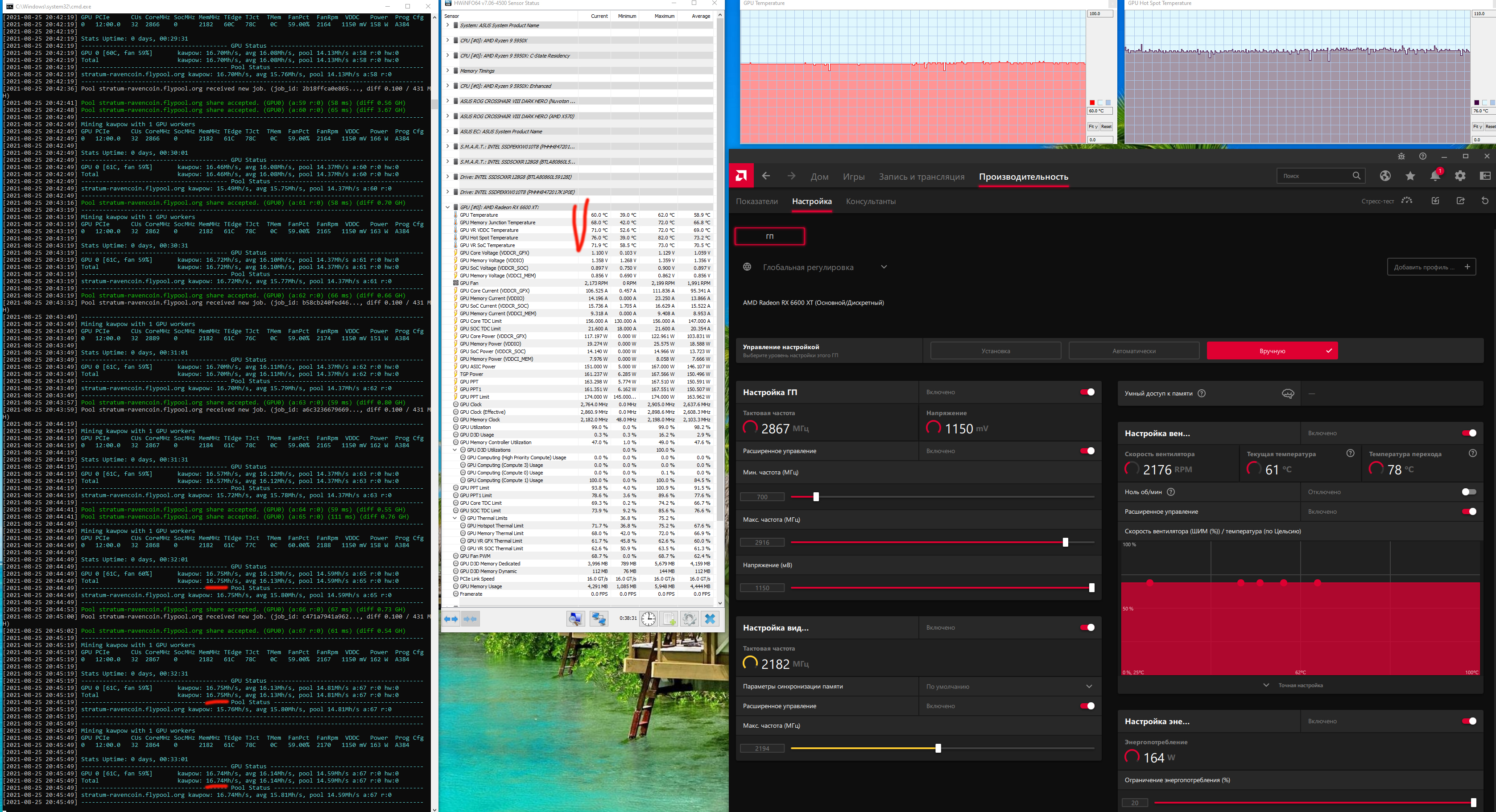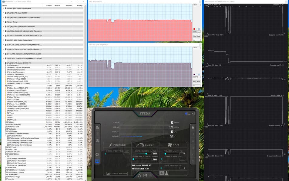 Несмотря на то, что у карт на базе Radeon имеется возможность получать температуру нагрева микросхем памяти GDDR6 (мы помним, что GDDR6X имеет свой датчик температуры, и его уже используют некоторые программы слежения за состоянием ПК типа HWinfo), эти данные получает ПО AMD, а сторонним программам их, видимо, получить трудно, поэтому температура нагрева памяти в HWinfo то появлялась, то пропадала. Но в целом нагрев был некритичным.