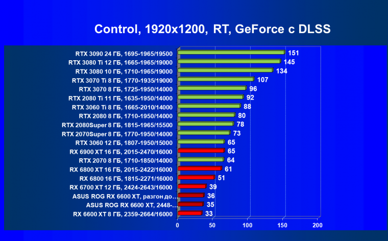 Как и в предыдущем рейтинге, из-за сильного падения производительности в играх с трассировкой лучей все семейство Radeon RX 6000 оказалось в аутсайдерах, а лидируют в группе GeForce RTX 2070 Super и GeForce RTX 3060. Поэтому если вы хотите играть «с лучами» в разрешении уровня Full HD, то лучше присмотреться к GeForce RTX 3060, хотя ему потребуется еще и включить DLSS для компенсации падения производительности с RT, а это довольно существенное сужение ассортимента игр (поддерживающих и RT, и DLSS одновременно).