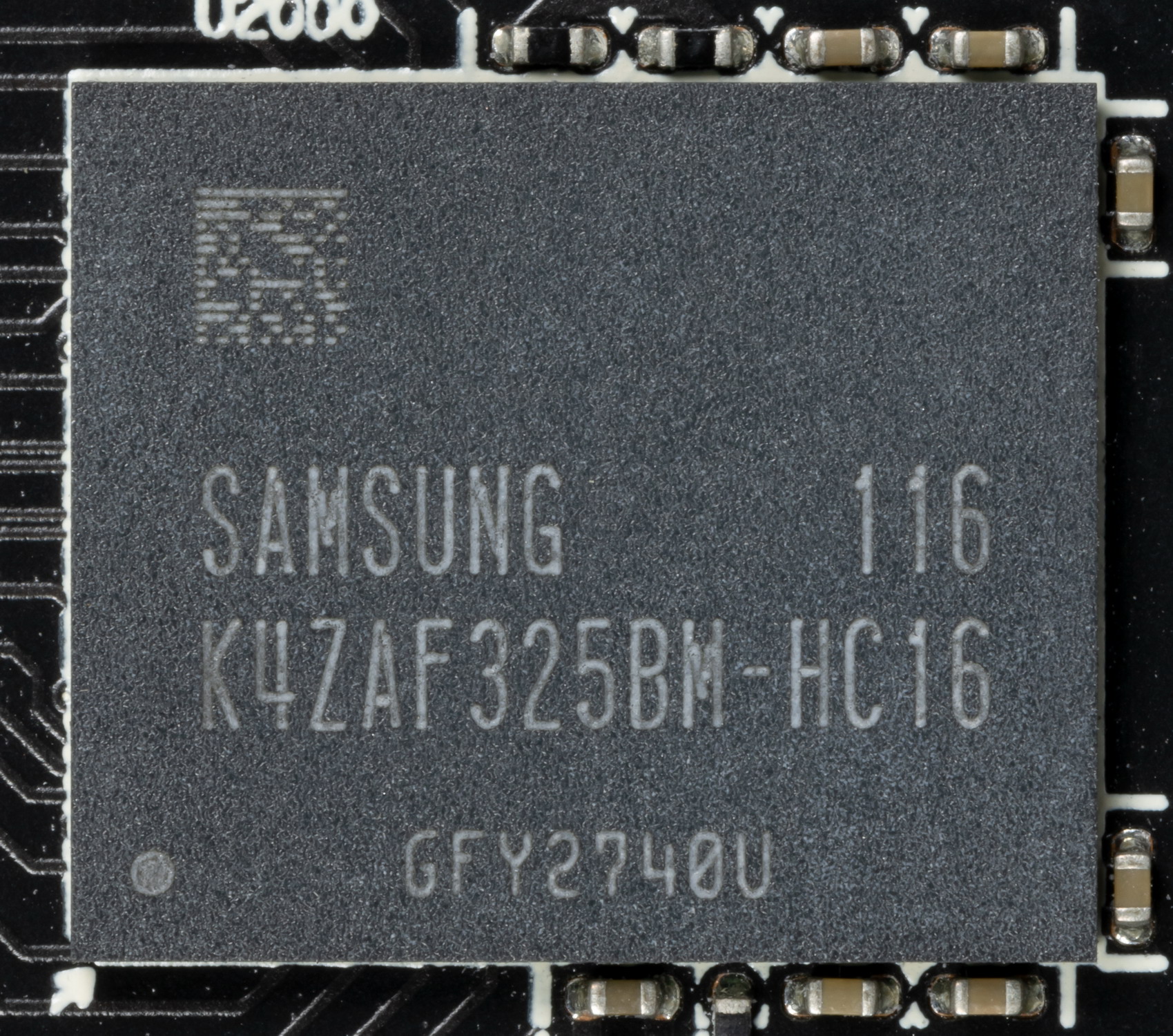 Карта имеет 8 ГБ памяти GDDR6 SDRAM, размещенной в 4 микросхемах по 16 Гбит на лицевой стороне PCB. Микросхемы памяти Samsung (GDDR6, K4ZAF325BM-HC16) рассчитаны на условную номинальную частоту работы в 4000 (16000) МГц.