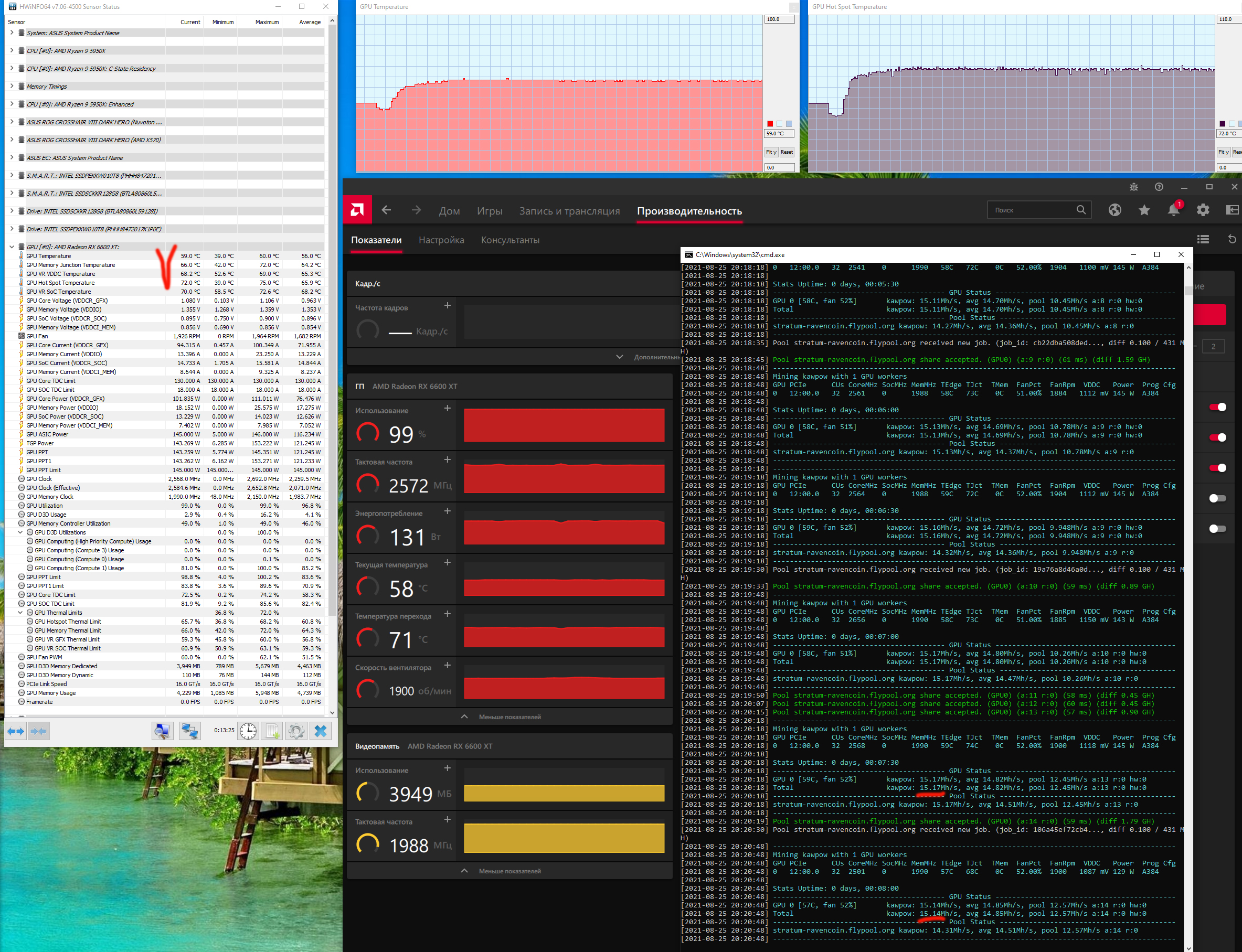 Для подсчета хэшрейта (hashrate) при майнинге «эфира» (Ethereum/ETH/ETC) и «вороны» (Ravencoin/RVN) использовался майнер T-Rex (0.21.06), фиксировался средний показатель за час в двух режимах: