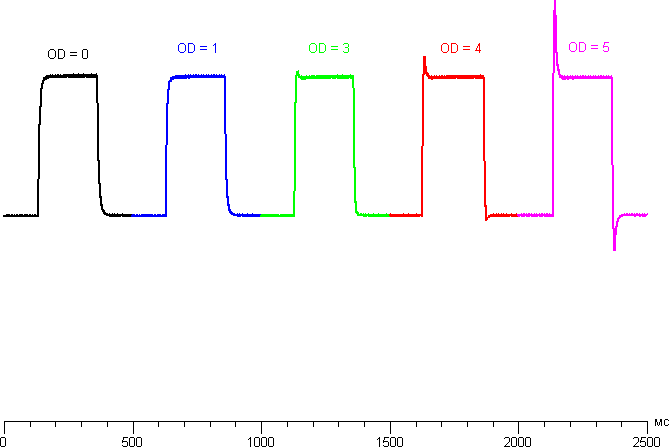 Видно, что OD никак не влияет на переходы между черным и белым, но полутоновые переходы ускоряются. При значениях OD, отличных от 0, на графиках некоторых переходов появляются характерные всплески яркости, например, так выглядят графики для перехода между оттенками 40% и 60% (значения OD приведены над графиками):