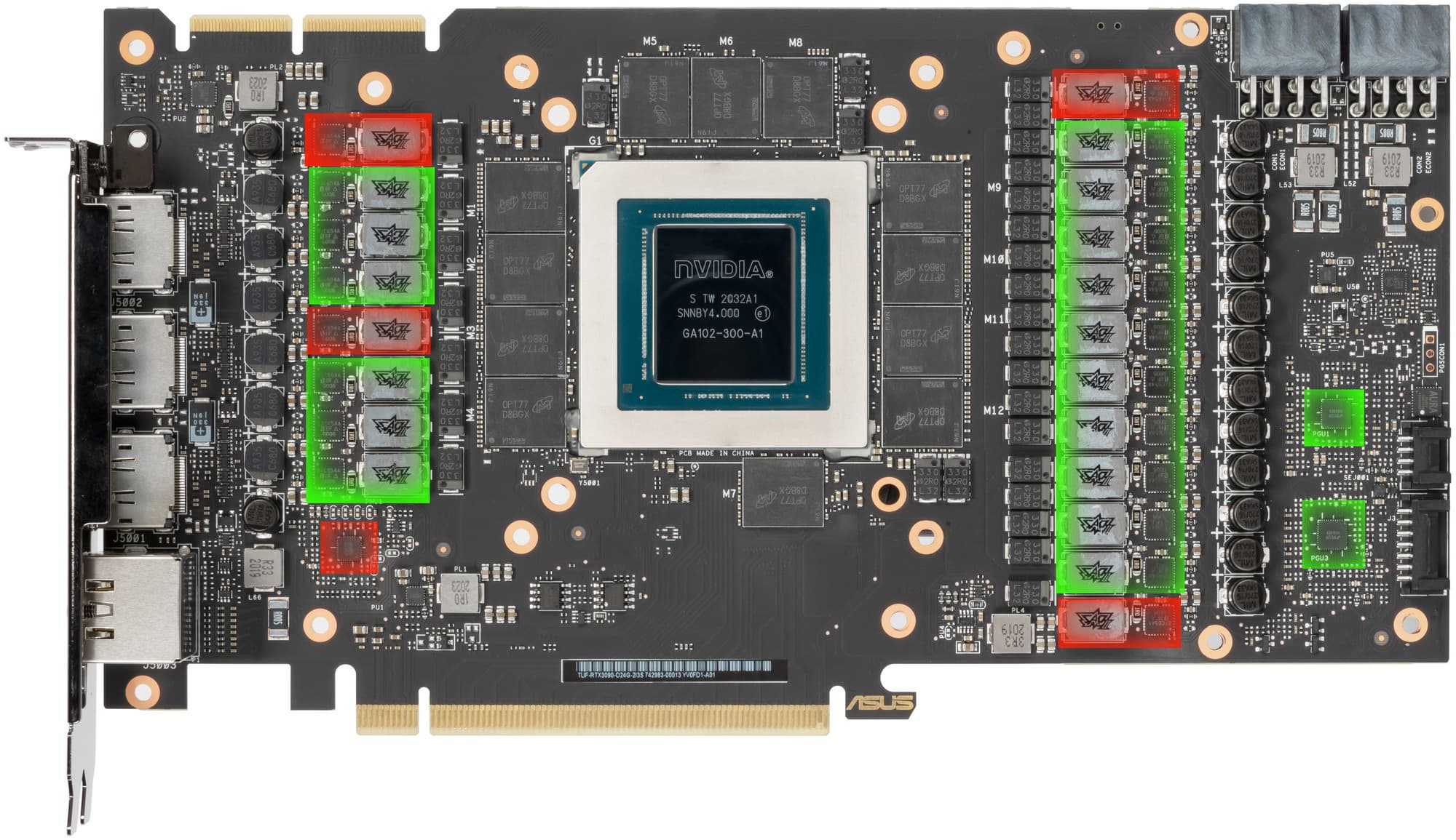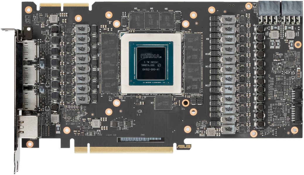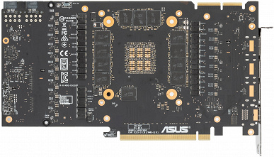 Несмотря на то, что в Nvidia сделали два варианта дизайна PCB для RTX 3090 (для своих карт Founders Edition и для партнеров), инженеры Asus создали собственный дизайн, который лишь в плане размещения микросхем памяти базируется на эталонном.