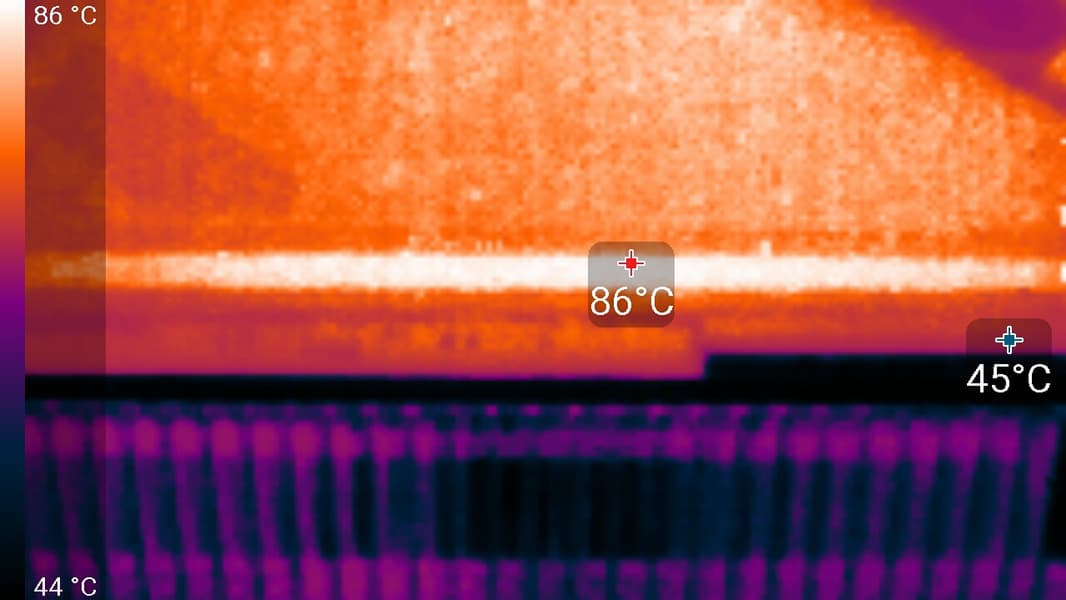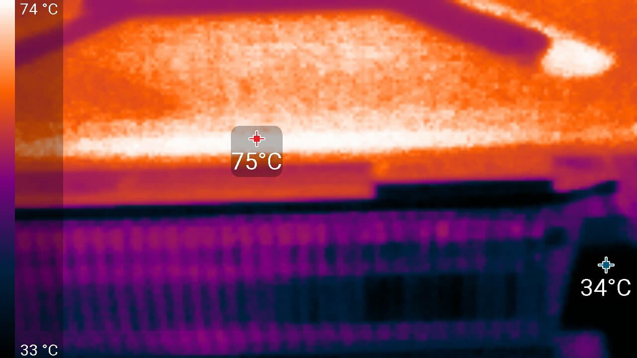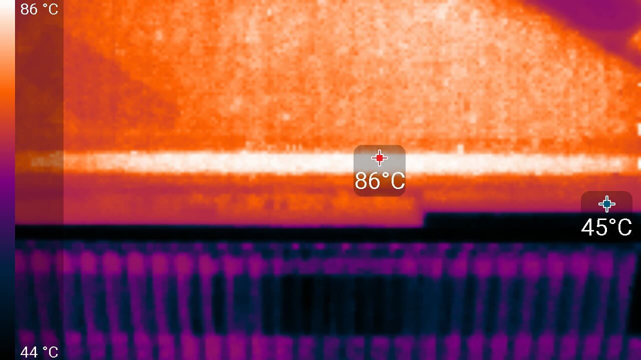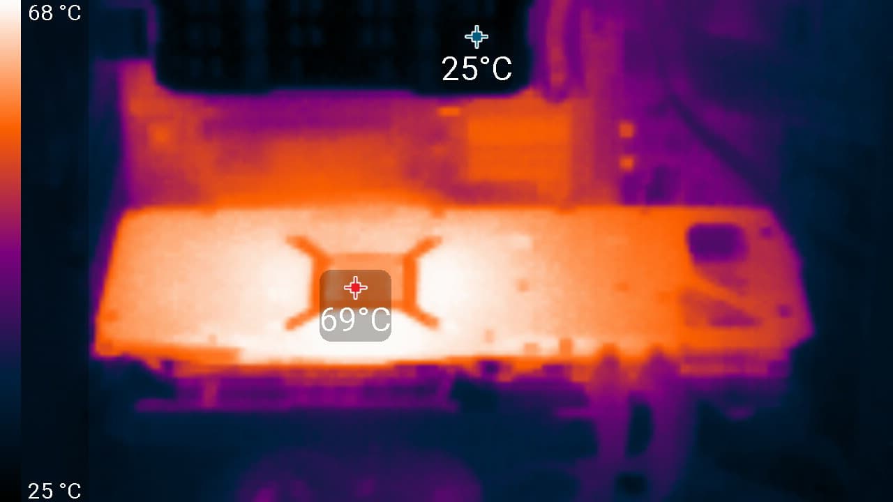 Максимальный нагрев наблюдался в центральной части PCB, в основном около ядра (а микросхемы памяти GDDR6X оказались самыми нагревающимися элементами).