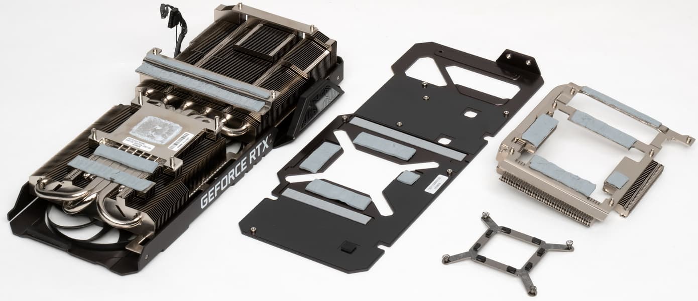 Основой СО является огромный двухсекционный пластинчатый никелированный радиатор с тепловыми трубками, припаянными к подошве прямого контакта с GPU. Этот же радиатор служит охладителем и для ряда преобразователей питания VRM с помощью небольших подошв. А вот для микросхем памяти на лицевой стороне PCB, а также для остальных мосфетов VRM предусмотрен отдельный радиатор, прикручивающийся к основному. Задняя пластина выполнена из алюминия с электрозащитным покрытием и имеет тройное предназначение: служит элементом защиты PCB; через термоинтерфейс участвует в охлаждении микросхем памяти на оборотной стороны платы, а также самой PCB в районе преобразователей питания; ну и еще является ребром жесткости всей карты, будучи жестко прикрученной к крепежной планке (костылю). Из-за возросшей площади кристалла GPU стали применять «четырехлапый» амортизатор, который помогает равномерно распределять прижим подошвы радиатора по всей площади кристалла.