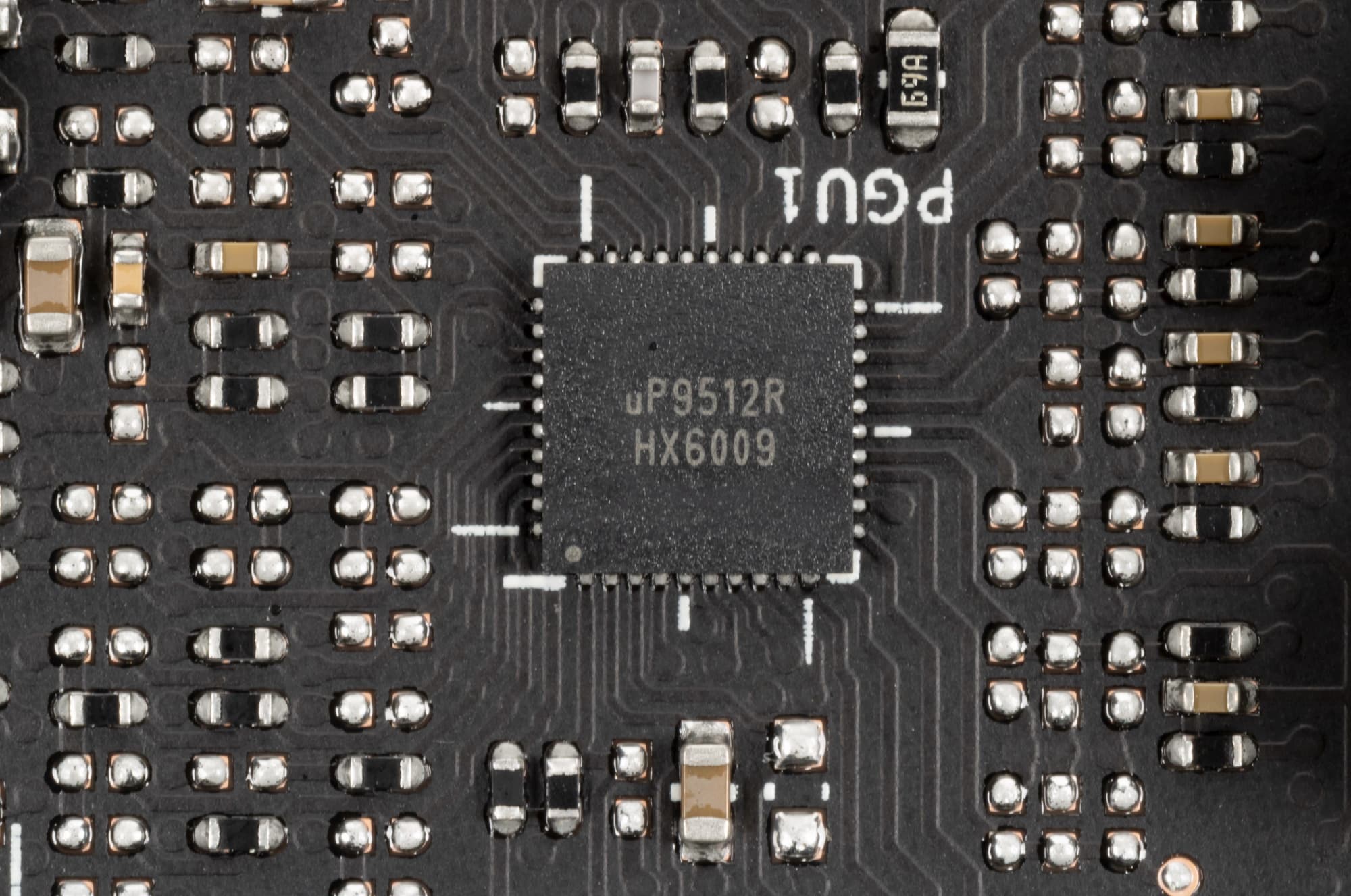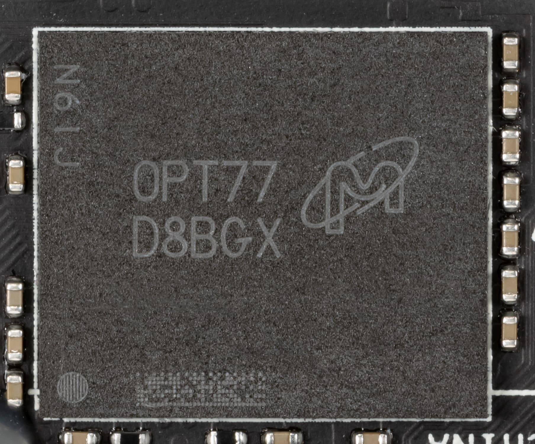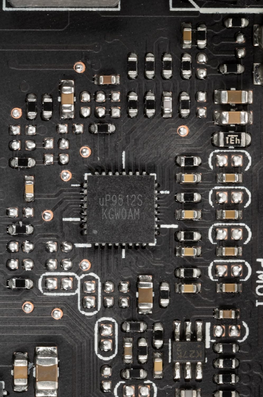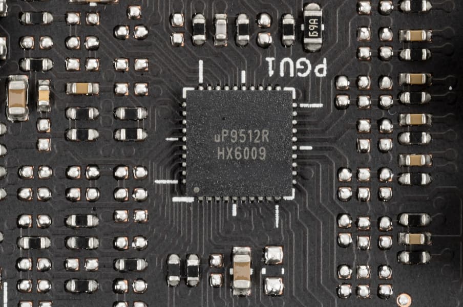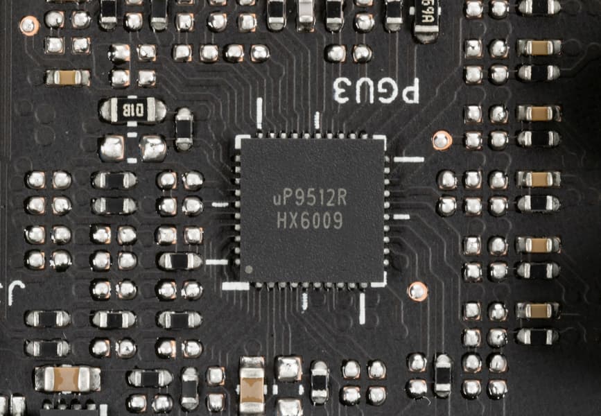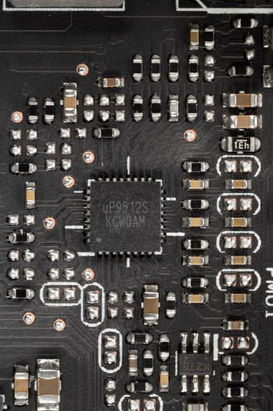 На той же лицевой стороне имеется другой ШИМ-контроллер uPI: uP9512S, который управляет 4-фазной схемой питания микросхем памяти.