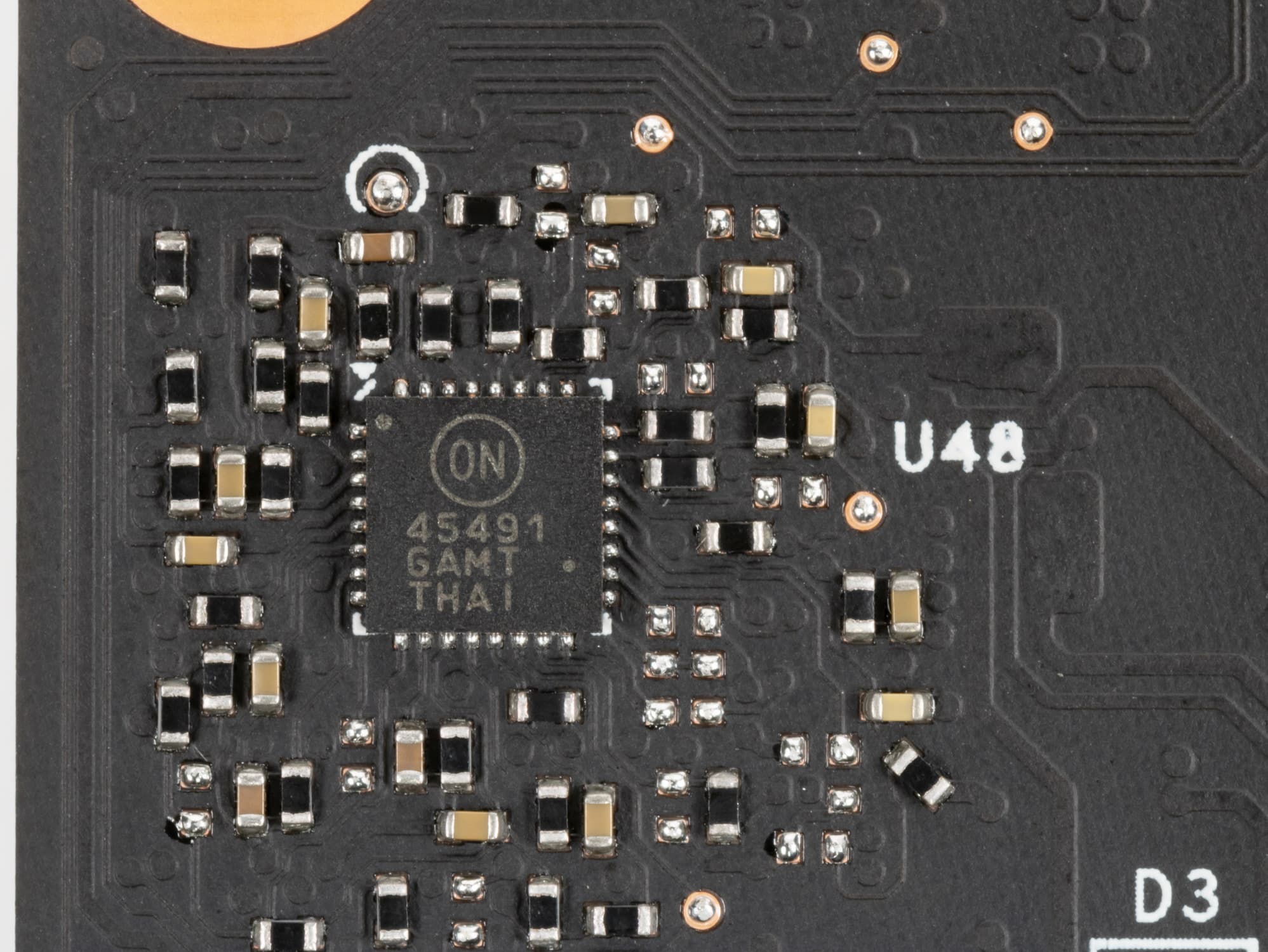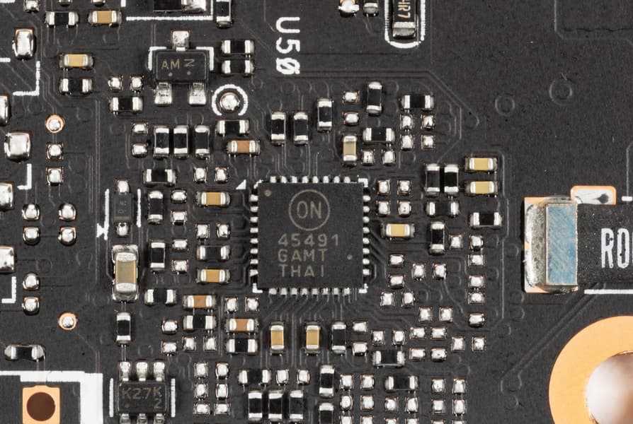Также имеются два контроллера NCP45491 (On Semiconductor), отвечающие за мониторинг карты (отслеживание напряжений и температуры) и подсветку, они расположены на разных сторонах PCB.
