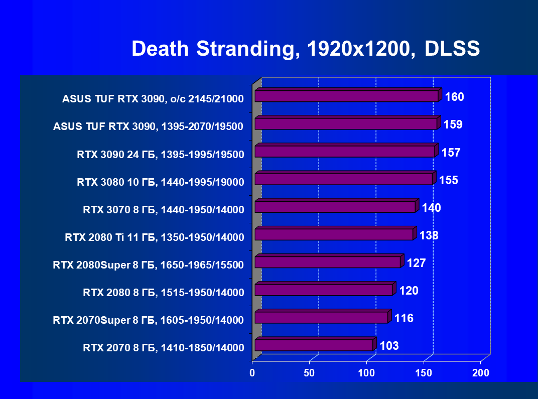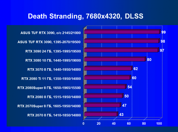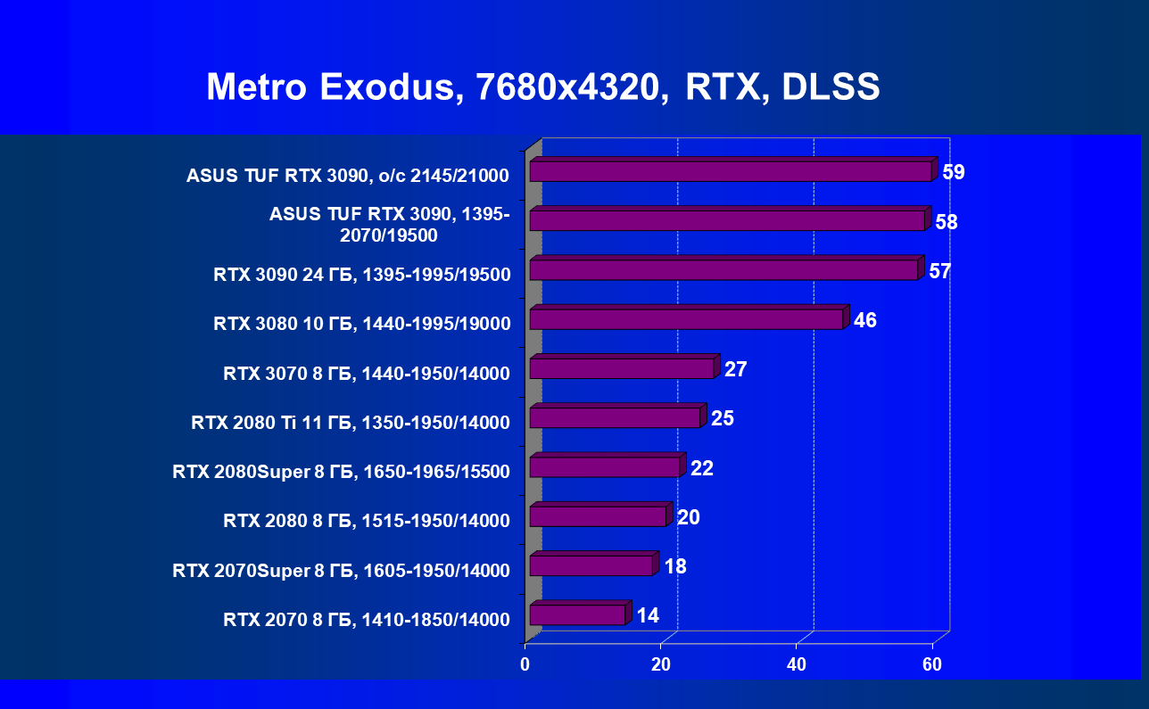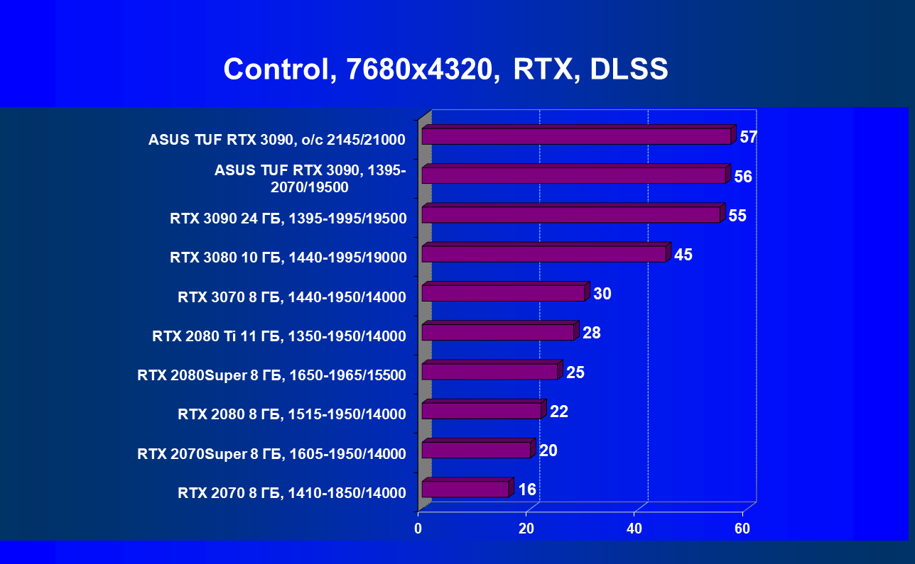 Стоит снова повторить, что наличие большого объема памяти и прекрасная производительность дает GeForce RTX 3090 право называться первым видеоускорителем игрового класса для разрешения 8К. Игры должны поддерживать умный антиалиасинг DLSS 2.0 (причем именно для разрешения 4К и выше), тогда комфорт при игре на огромных 8К-телевизорах будет обеспечен при сохранении всех настроек графики по максимуму.