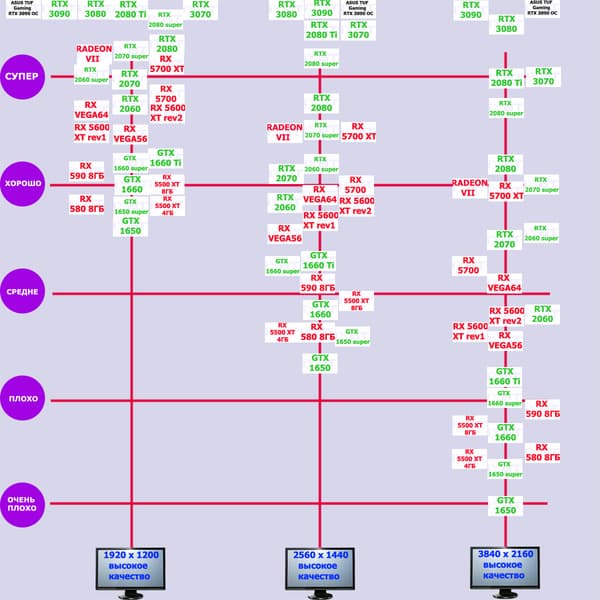 Стандартные результаты тестов без использования аппаратной трассировки лучей в разрешениях 1920×1200, 2560×1440 и 3840×2160