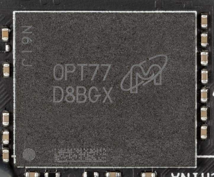 Карта имеет 24 ГБ памяти GDDR6X SDRAM, размещенной в 24 микросхемах по 8 Гбит на обеих сторонах PCB (по 12 на каждой). Микросхемы памяти Micron (GDDR6X, MT61K256M32JE-21) рассчитаны на номинальную частоту работы в 5250 (21000) МГц. Расшифровщик кодов на упаковках FBGA находится здесь.