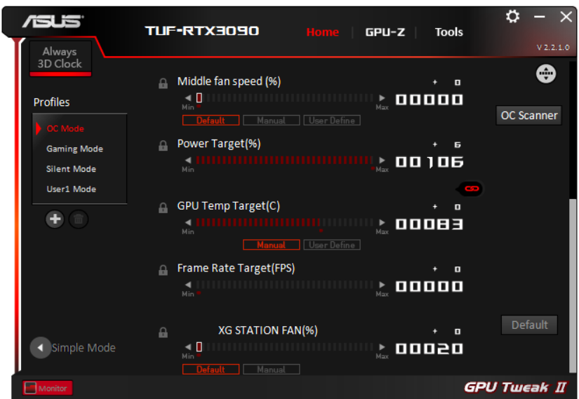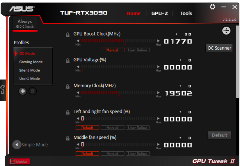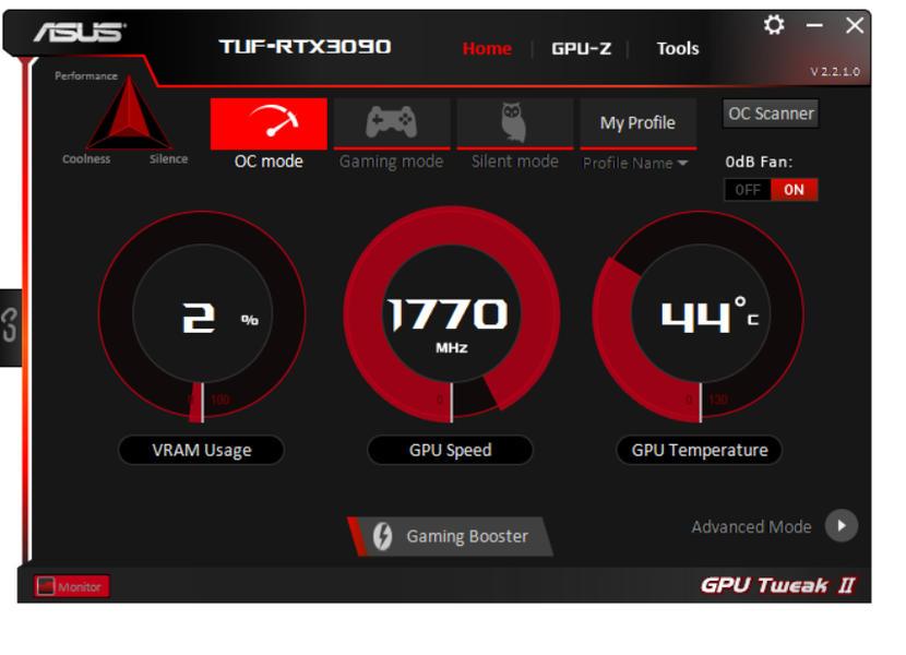 Штатные частоты памяти у карты Asus равны референсным значениям, а частота работы ядра в режиме по умолчанию (Gaming mode) лишь чуть выше (на 1,2%), но зато OC Mode поднимает частоту на 3,7% относительно референсных величин. Я попробовал ручной разгон, TDP можно поднять лишь до 110%, так что, скорее всего, драйверы ограничат разгон привычными 3%-5% прироста производительности вне зависимости от установки частот. Я попытался выставить +120 МГц по ядру и +750 МГц по памяти, что дало максимальные частоты в 2145/21000 МГц, это на 7,5% выше референсных величин.