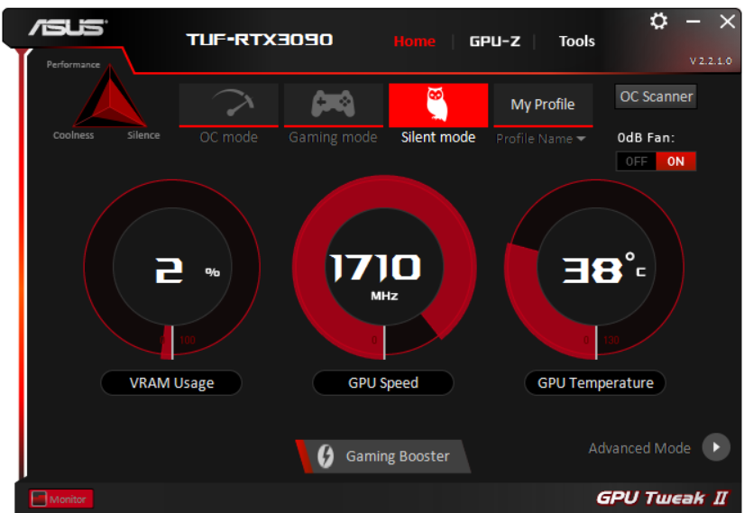 В простое режимы Performance Mode и Quiet Mode совершенно не отличались: в 2D температура была не выше 47 °C, вентиляторы не работали, уровень шума был равен фоновому — 18 дБА.