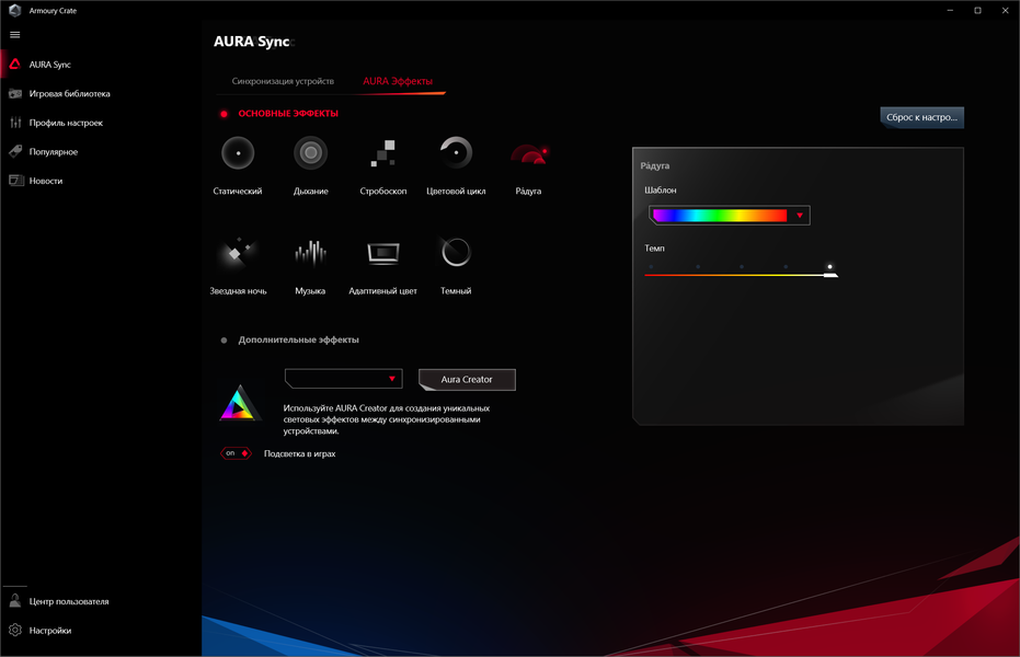 Выбор режимов не очень широк, однако имеется программа Aura Creator, которая также распространяется бесплатно, и с ее помощью можно создать свои сценарии подсветки.