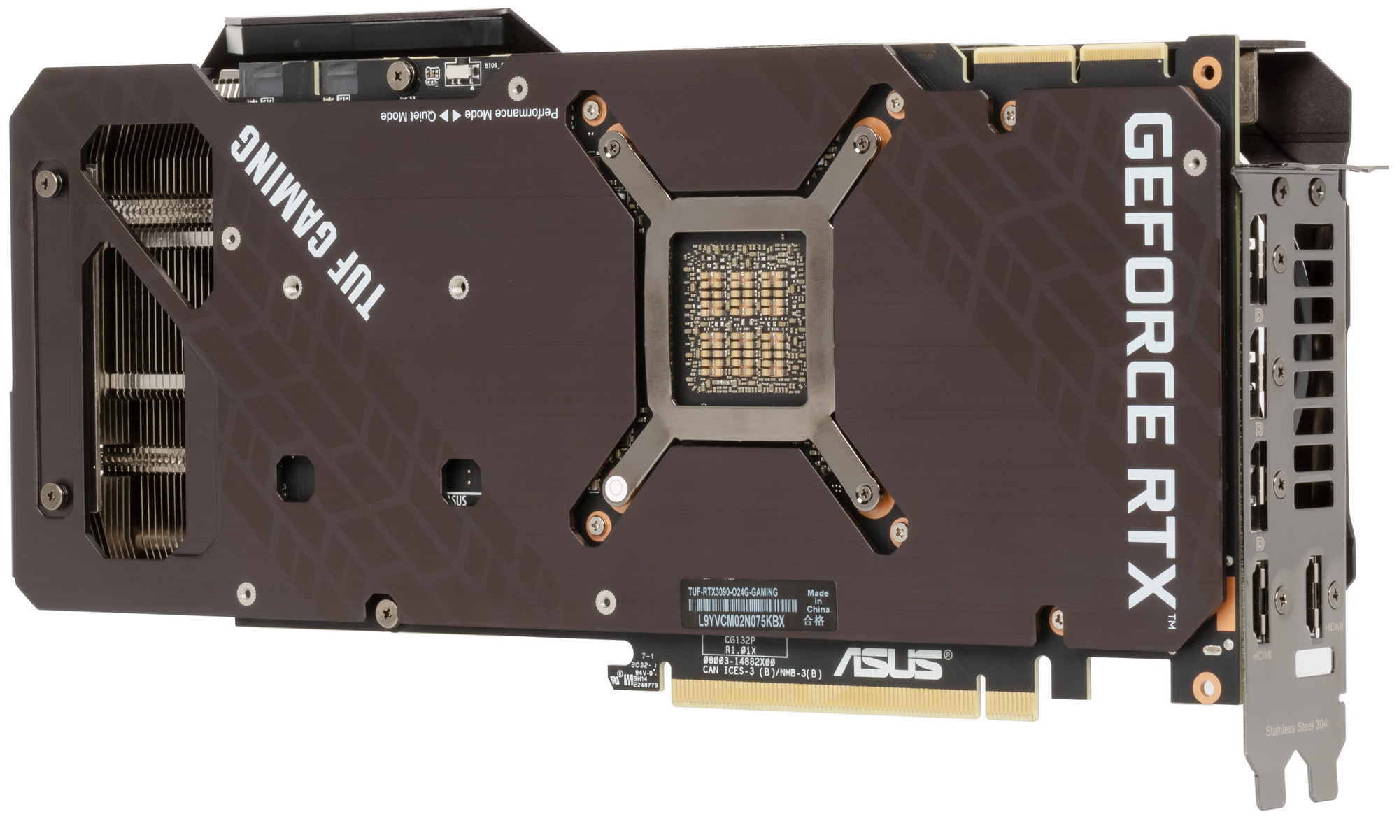Asus TUF Gaming GeForce RTX 3090 OC Edition (24 ГБ) — не самый громоздкий представитель мощнейшего на сегодня 3D-ускорителя GeForce RTX 3090, имеющий при этом крайне эффективный кулер, который и охлаждает очень хорошо, и достаточно тихий. Карта предлагает два режима работы СО (Performance и Quiet), и во втором работает вообще очень тихо. Еще из особенностей отметим наличие пяти видеовыходов: к обычному набору из трех DP 1.4a и одного HDMI 2.1 добавился второй HDMI 2.1 (однако все равно одновременно можно выводить картинку только на 4 приемника). Кронштейн для закрепления карты в корпусе в данном случае отсутствует, но карта сама по себе имеет весьма жесткую конструкцию.
