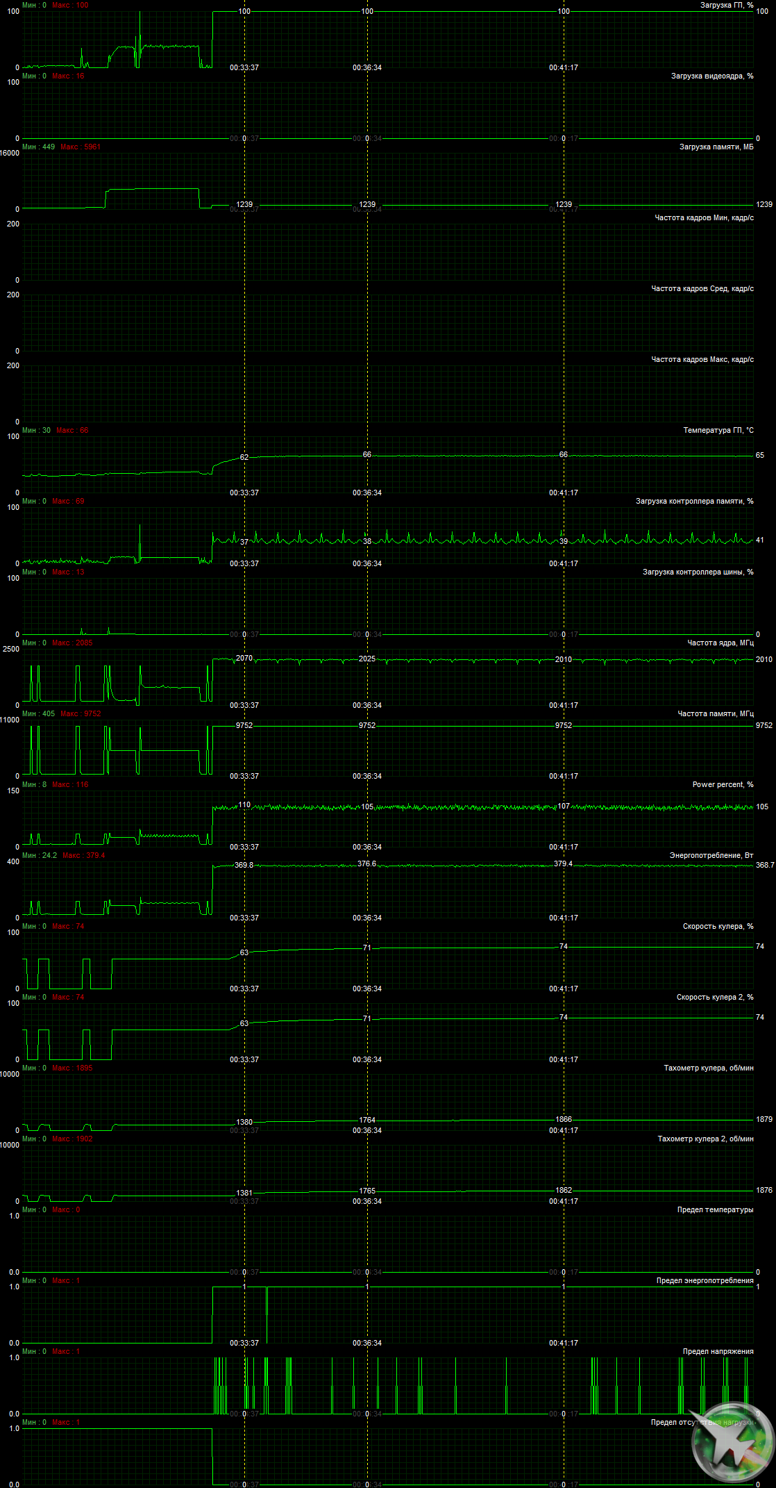 После 6-часового прогона под нагрузкой в режиме Performance максимальная температура ядра не превысила 66 градусов, что является хорошим результатом для видеокарт флагманского уровня. Энергопотребление карты доходило почти до 380 Вт.