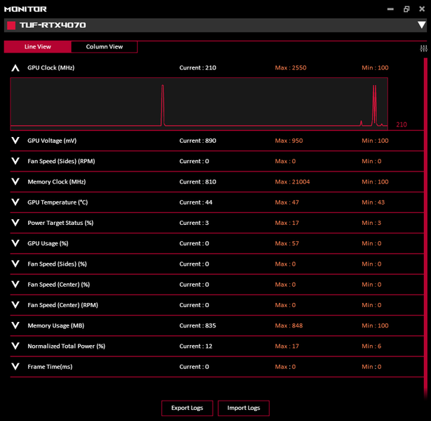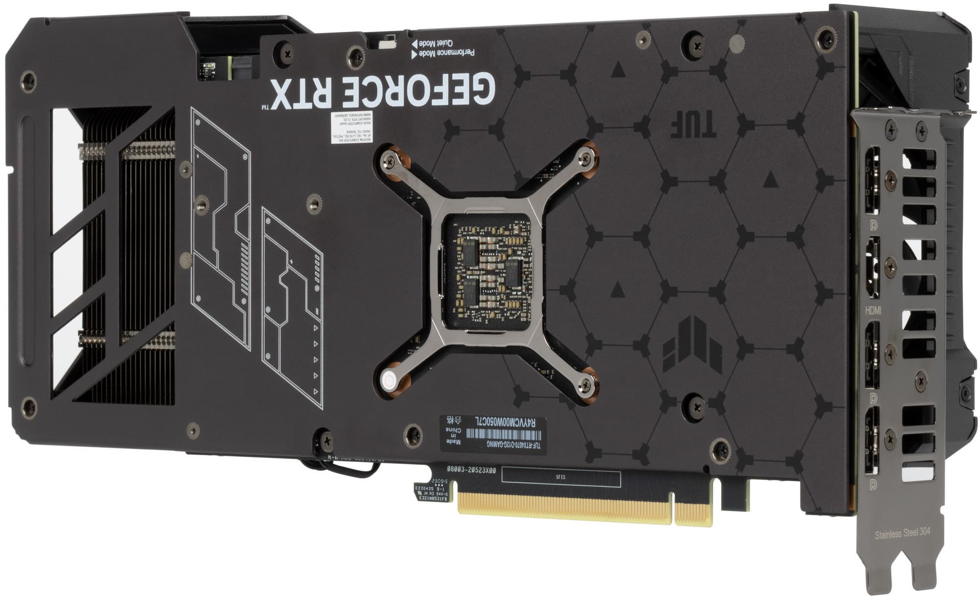 Карта имеет двойной BIOS, что уже традиционно для топовых решений Asus. На торце карты есть переключатель между версиями BIOS, они названы Performance mode (PMode) и Quiet mode (QMode) — производительный и тихий режимы. Частоты работы памяти, Boost и максимальные значения частот работы GPU в этих режимах совершенно одинаковые, но для них выставлены разные лимиты потребления, поэтому мгновенные частоты работы GPU отличаются (в случае PMode более высокие мгновенные частоты встречаются чаще). Также, ожидаемо, есть разница в настройке работы вентиляторов.