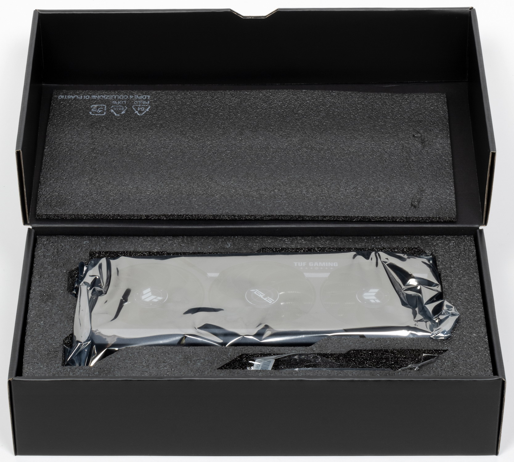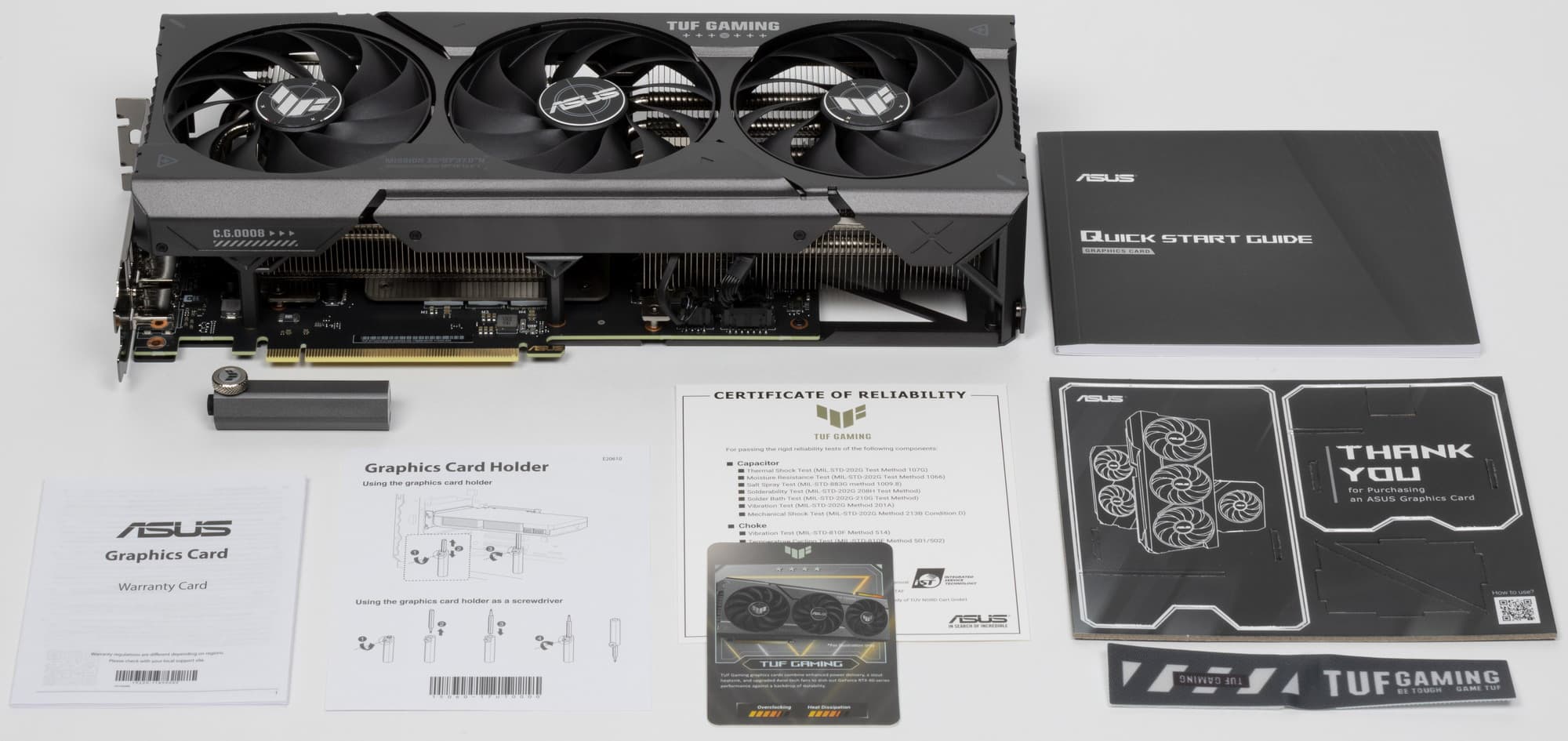В комплекте поставки кроме традиционного краткого руководства пользователя также имеются переходник для разъема питания, раздвижная подставка/отвертка, фирменные стяжка и карточка клуба TUF Gaming.