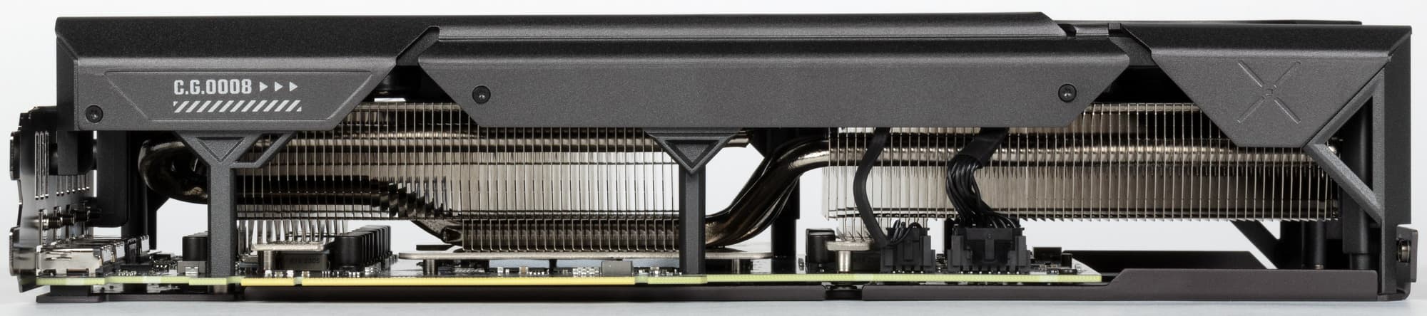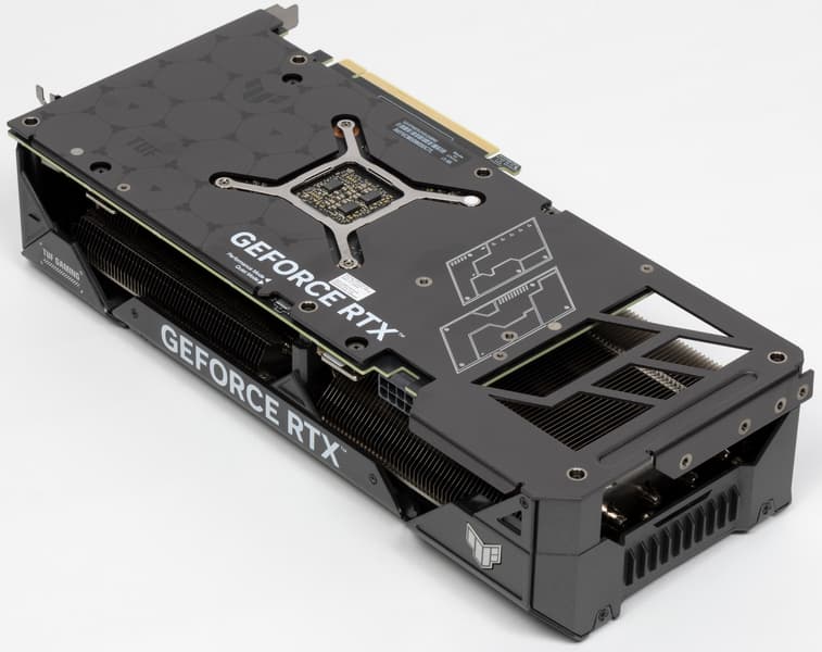 Задняя пластина не только служит элементом защиты PCB, но и участвует в охлаждении оборотной стороны платы через термопрокладки, которые отводят тепло в зоне видеопамяти. Также пластина оснащена большими вырезами для лучшего сквозного продува радиатора.