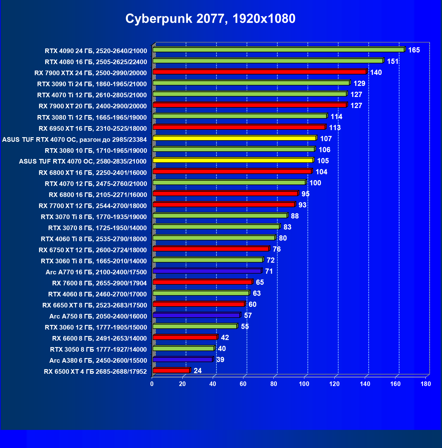 | 05 | Asus TUF RTX 4070 OC, разгон до 2985/23384 | 928 | 136 | 68 000 |