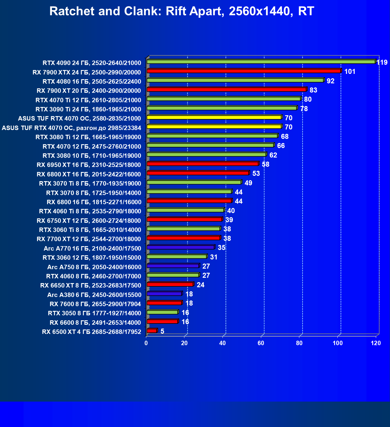 | 17 | RX 7700 XT 12 ГБ, 2544—2700/18000 | 103 | 597 | 58 000 |