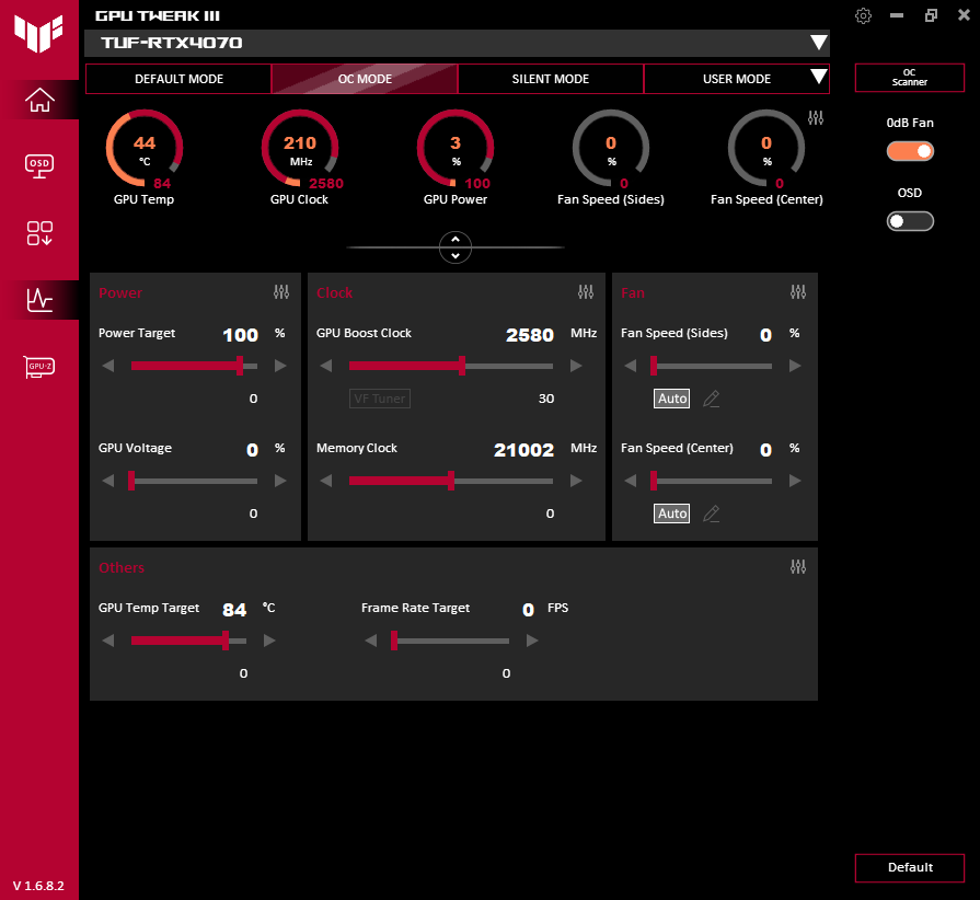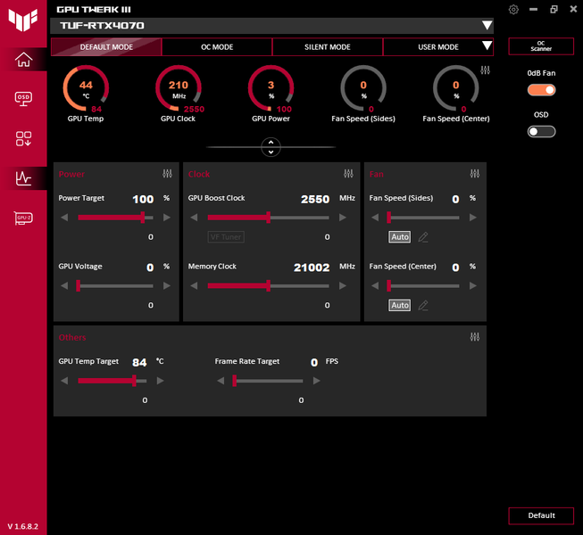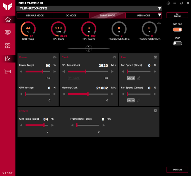 В простое режимы Performance Mode и Quiet Mode совершенно не отличались: в 2D температура была не выше 33 °C, вентиляторы не работали, уровень шума был равен фоновому — 18 дБА.