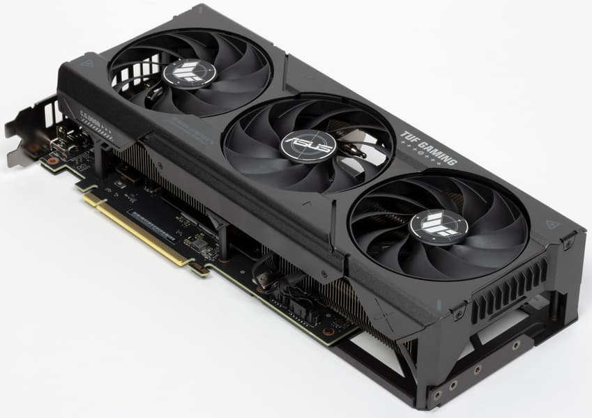 Карта Asus способна потреблять до 170 Вт (разовые всплески могут быть выше). Система охлаждения мощная, эффективная и очень тихая. Габариты видеокарты составляют 30 см в длину и 14 см в высоту, а по толщине она занимает 4 слота в корпусе. Набор видеовыходов — 3 DP и 1 HDMI.