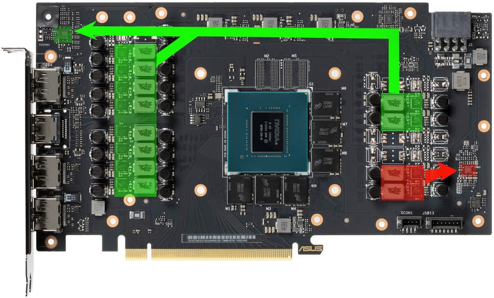 Зеленым цветом отмечена схема питания ядра, красным — памяти. Все ШИМ-контроллеры расположены на лицевой стороне PCB.