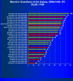 Рейтинг составлен по 9 тестам, в которых используется технология трассировки лучей и одновременно технология Nvidia DLSS, AMD FSR или Intel XeSS. Этот рейтинг нормирован по самому слабому ускорителю в данной группе — Radeon RX 6500 XT (то есть сочетание скорости и функций Radeon RX 6500 XT приняты за 100%).
