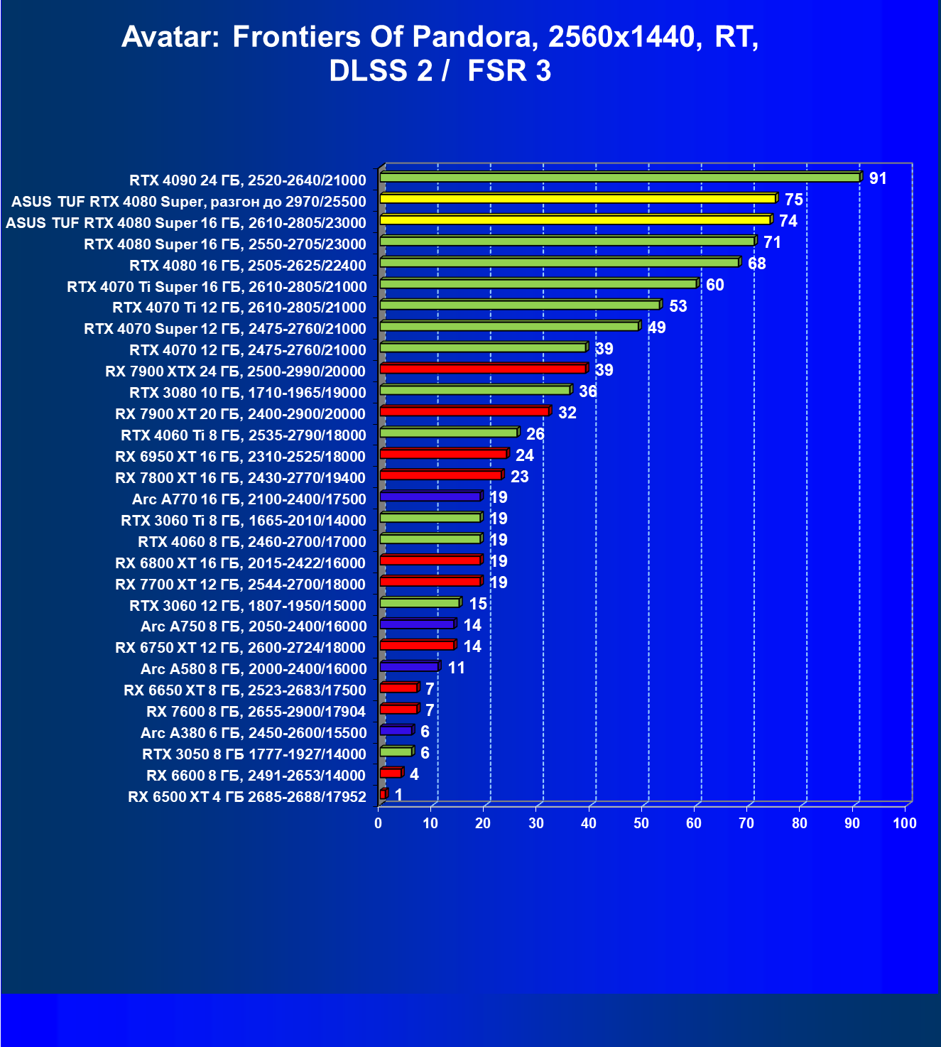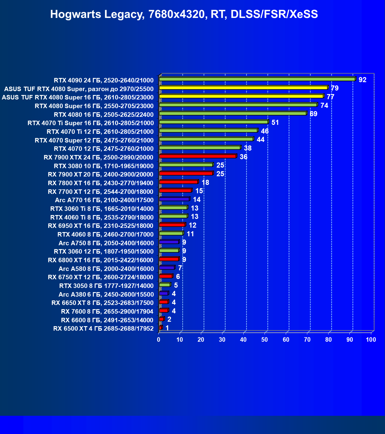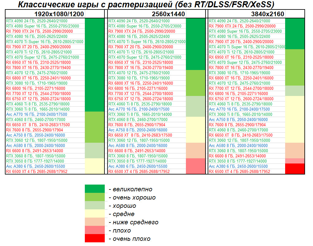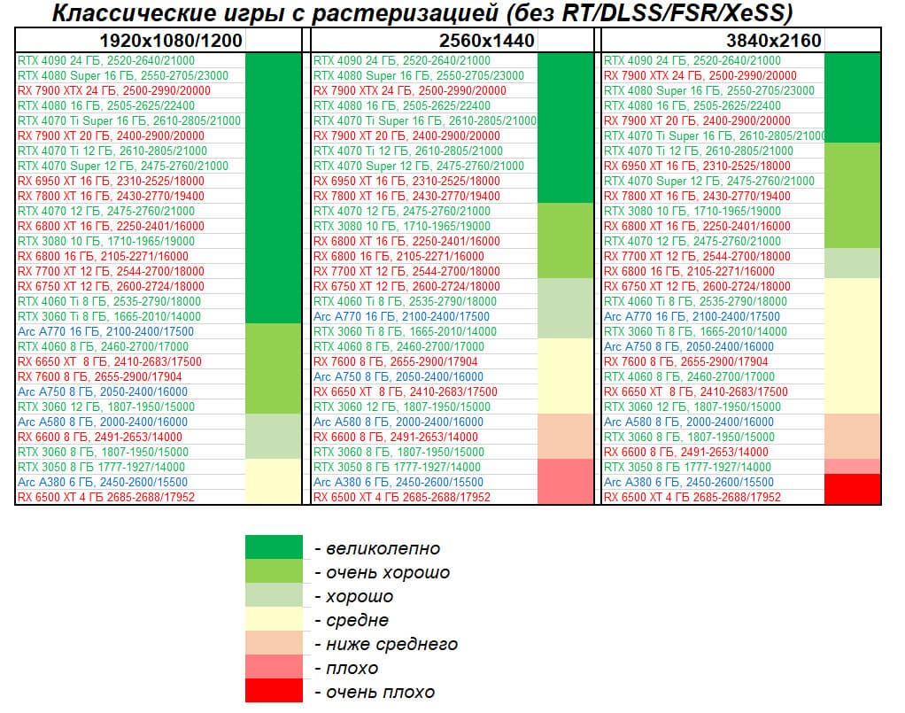 Однако это рейтинг производительности без использования RT и технологий масштабирования. Уверен, что в 2024 году глупо покупать флагманский ускоритель и не использовать все возможности современных игр.