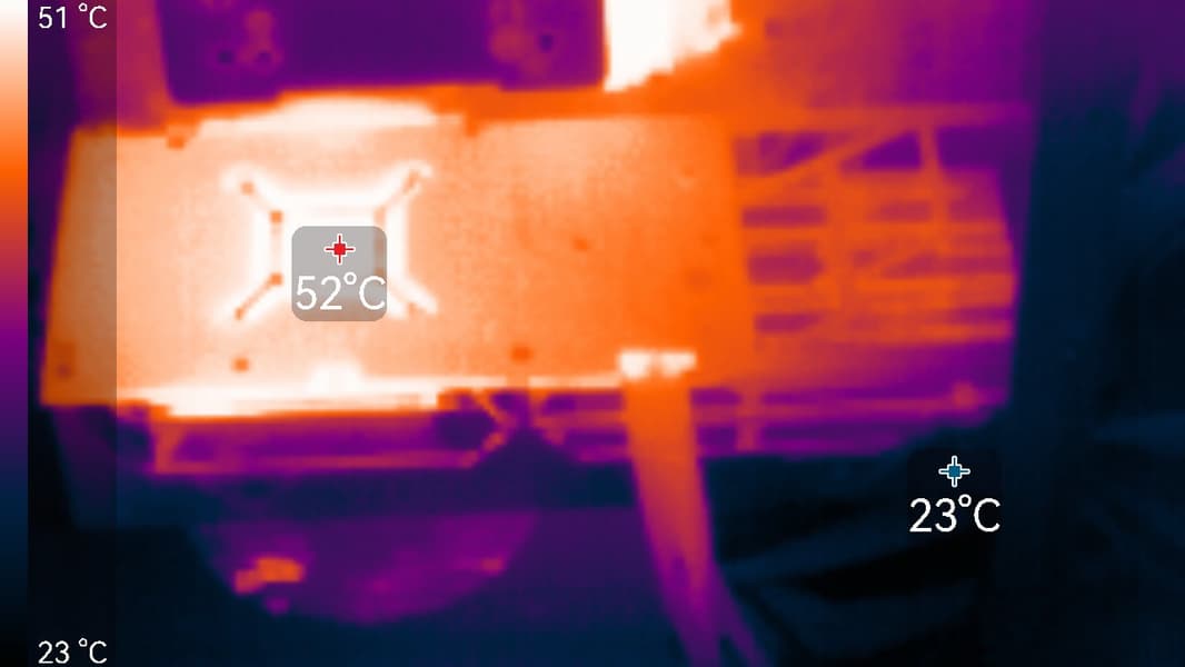 После 2-часового прогона под нагрузкой в режиме Performance максимальная температура ядра не превысила 63 градусов, а памяти — 66 °C, что является отличным результатом для видеокарт флагманского уровня. Энергопотребление карты доходило почти до 307 Вт (пиковое 355 Вт), а вентиляторы работали на уровне 1430 об/мин. Температура нагрева самой горячей точки ГП (hot spot) составляла 76 °C.