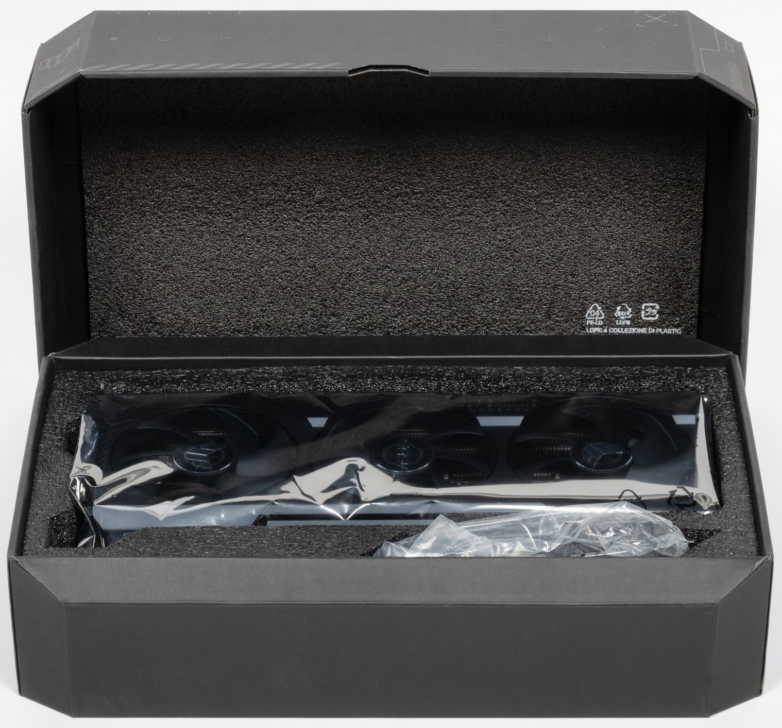 Поверх радиатора установлен кожух с тремя вентиляторами типа Axial-tech, у которых концы лопастей соединены кольцом для более четкого направления потоков воздуха на радиатор. Каждый вентилятор использует два шарикоподшипника. Как заявляет производитель, такая схема позволяет пропускать на 23% больше воздуха, что улучшает охлаждение, но при этом шум не возрастает.
