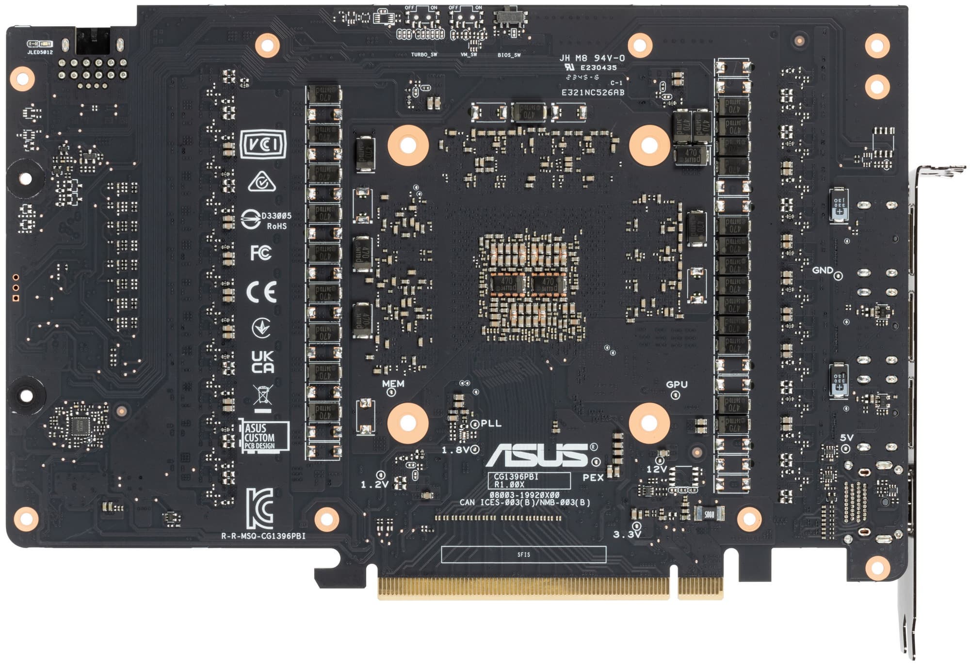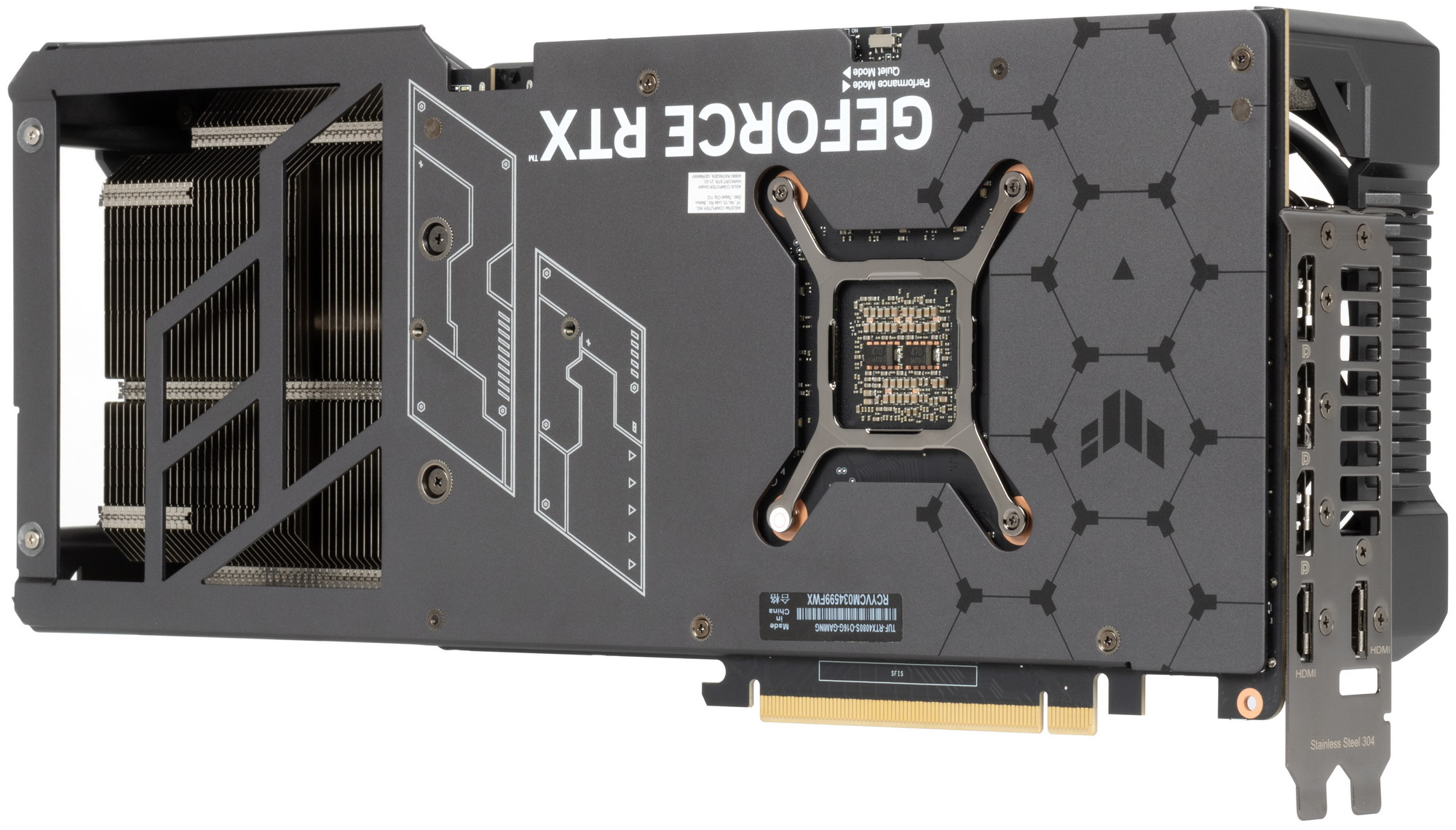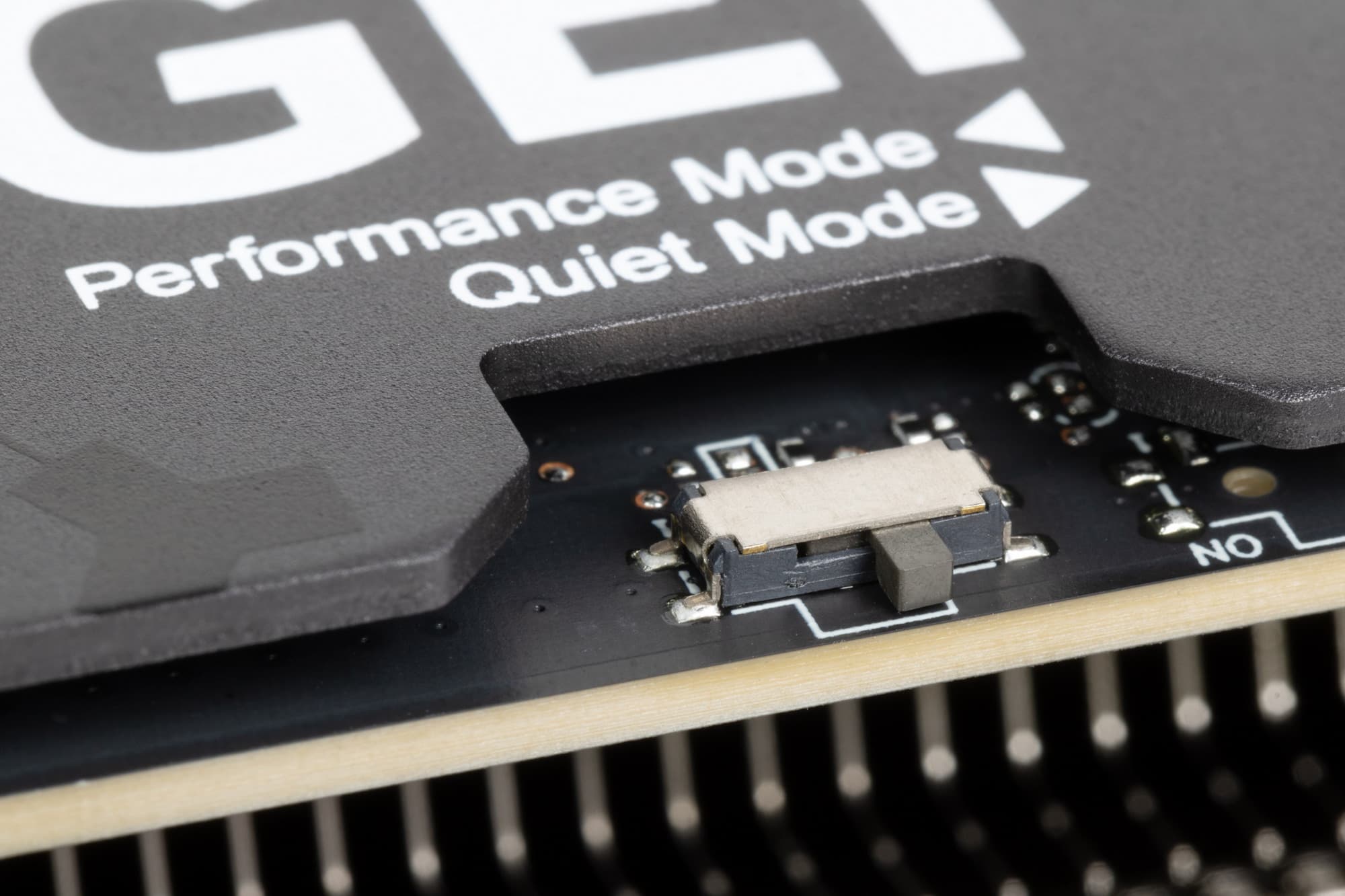Карта имеет двойной BIOS, что уже традиционно для топовых решений Asus. На торце карты есть переключатель версий BIOS (они названы Performance mode (PMode) и Quiet mode (QMode) — производительный и тихий режимы). Разница между режимами заключается, по сути, только в оборотах вентиляторов.