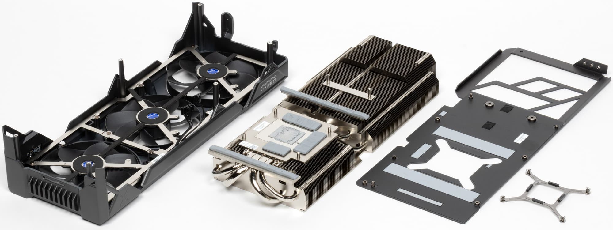 Микросхемы памяти охлаждаются с помощью этого же огромного теплоснимателя (через термопрокладки), а для преобразователей питания VRM имеются отдельные небольшие подошвы на том же радиаторе.