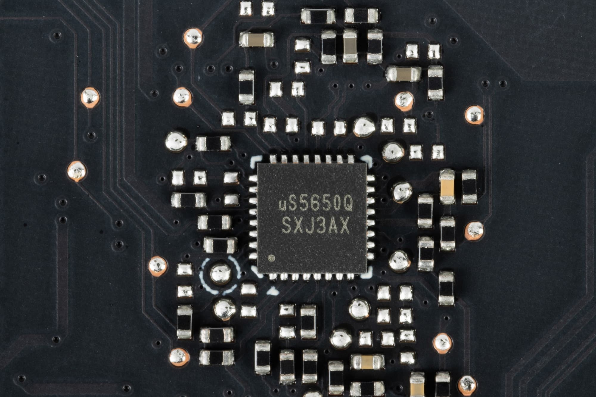 Также на лицевой стороне платы имеется контроллер uS5650Q (uPI Semi), который отвечает за мониторинг карты (отслеживание напряжений и температуры).