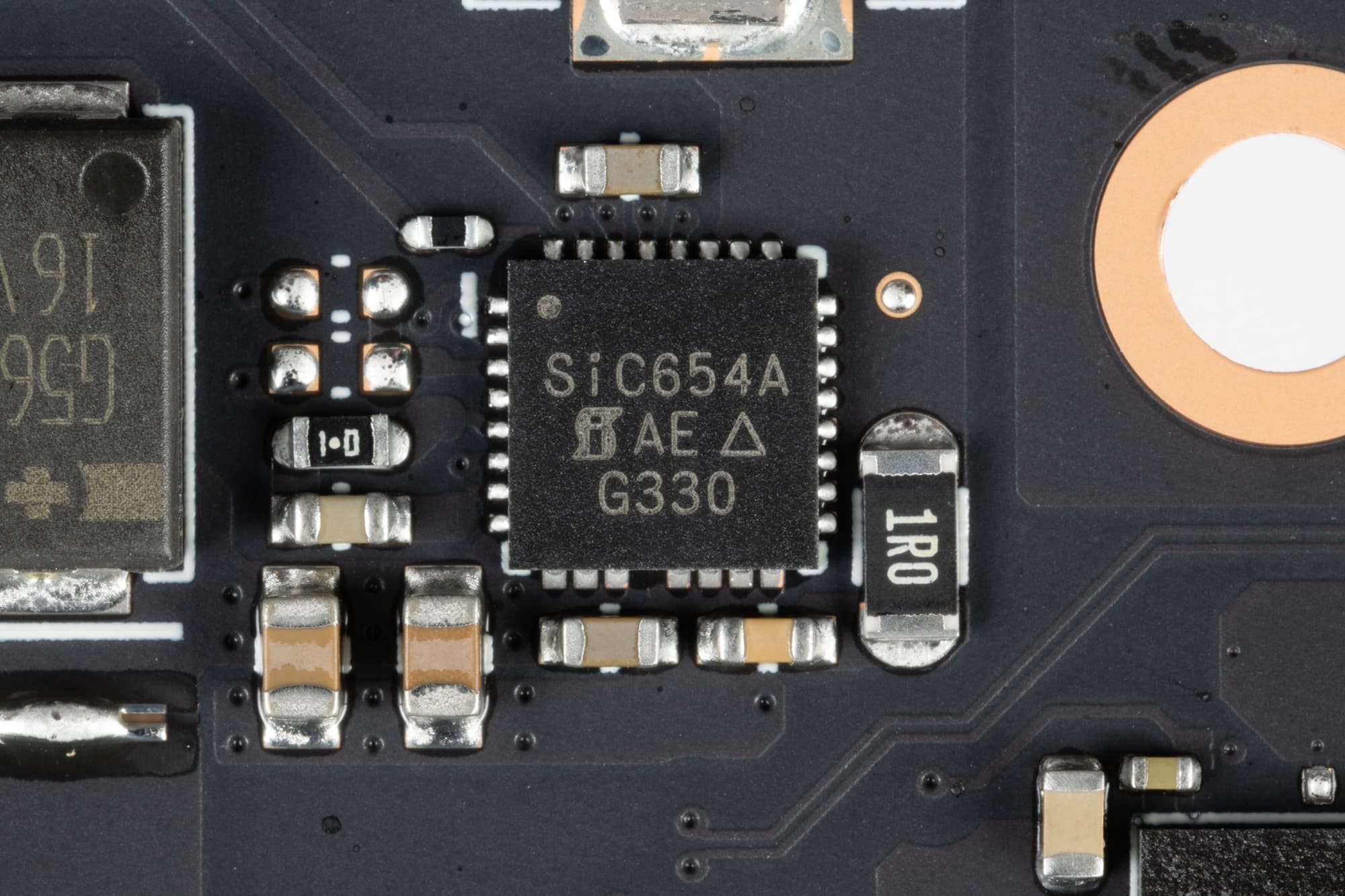 В преобразователе питания, традиционно для всех видеокарт Nvidia, используются транзисторные сборки DrMOS — в данном случае SiC654A (Vishay), каждая из которых рассчитана максимально на 50 А.