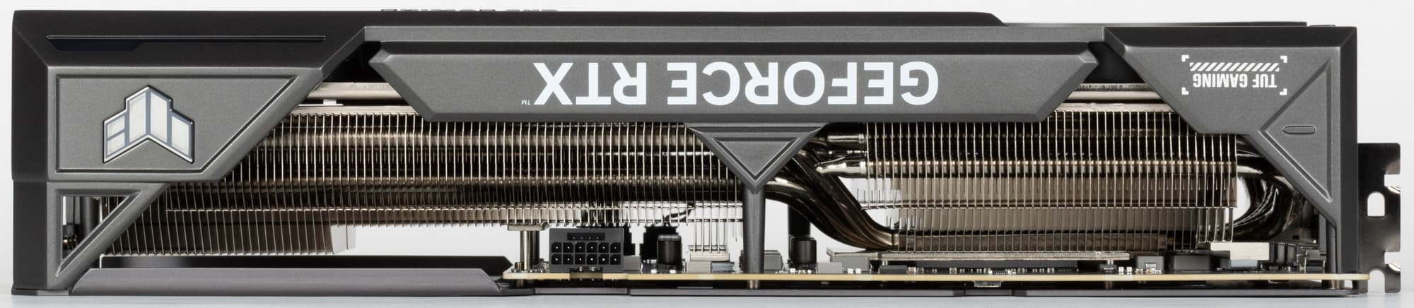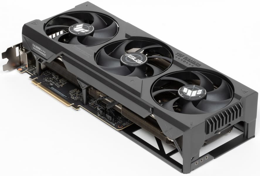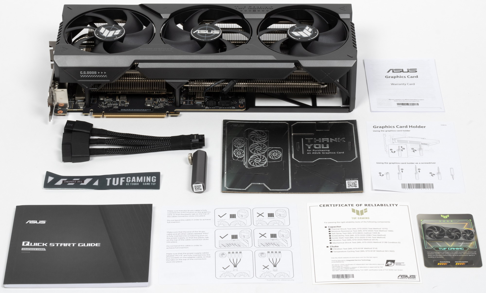 Карта Asus имеет 16-контактный разъем питания версии PCIe 5.0. Хотя в комплекте поставки имеется адаптер-переходник для подключения разъемов питания типа PCIe 2.0 (для 3 таких разъемов), лучше всё же использовать блоки питания стандарта ATX 3.0 с полноценной поддержкой питания PCIe 5.0 (с кабелем 12VHPWR). Имеющийся же переходник питания ни в коем случае нельзя изгибать непосредственно после 16-контактного разъема.