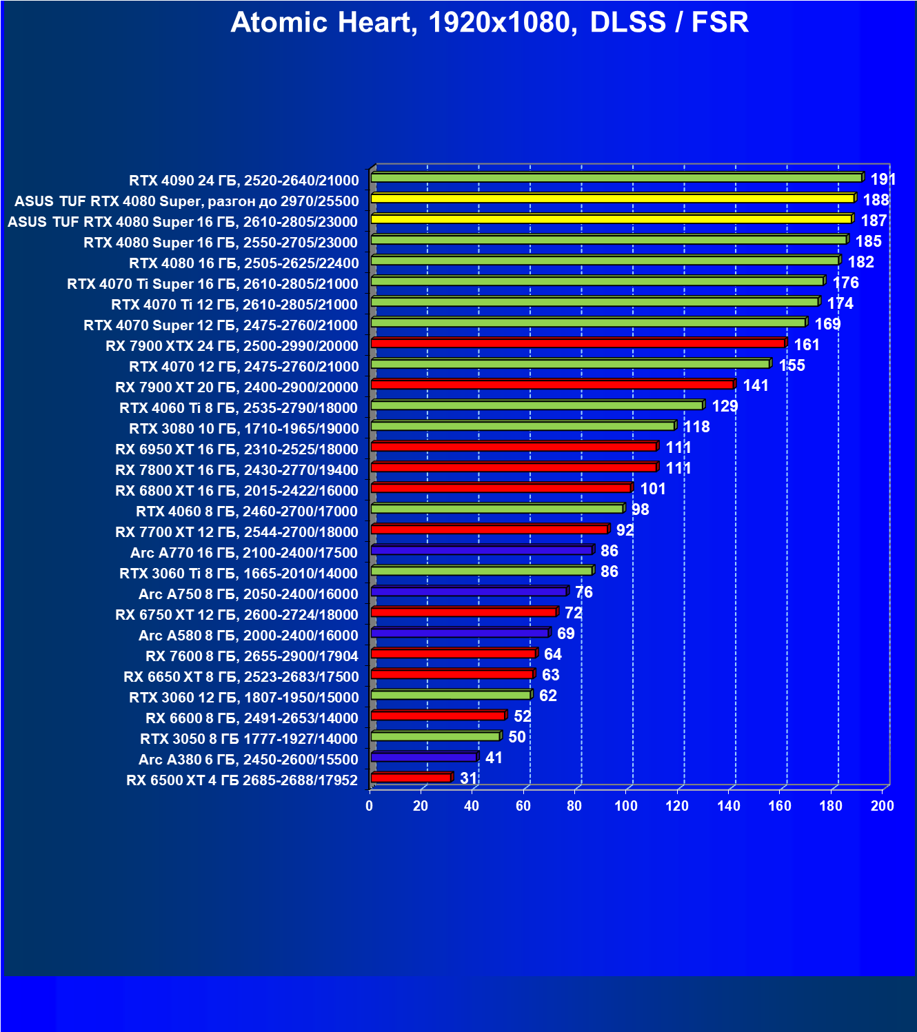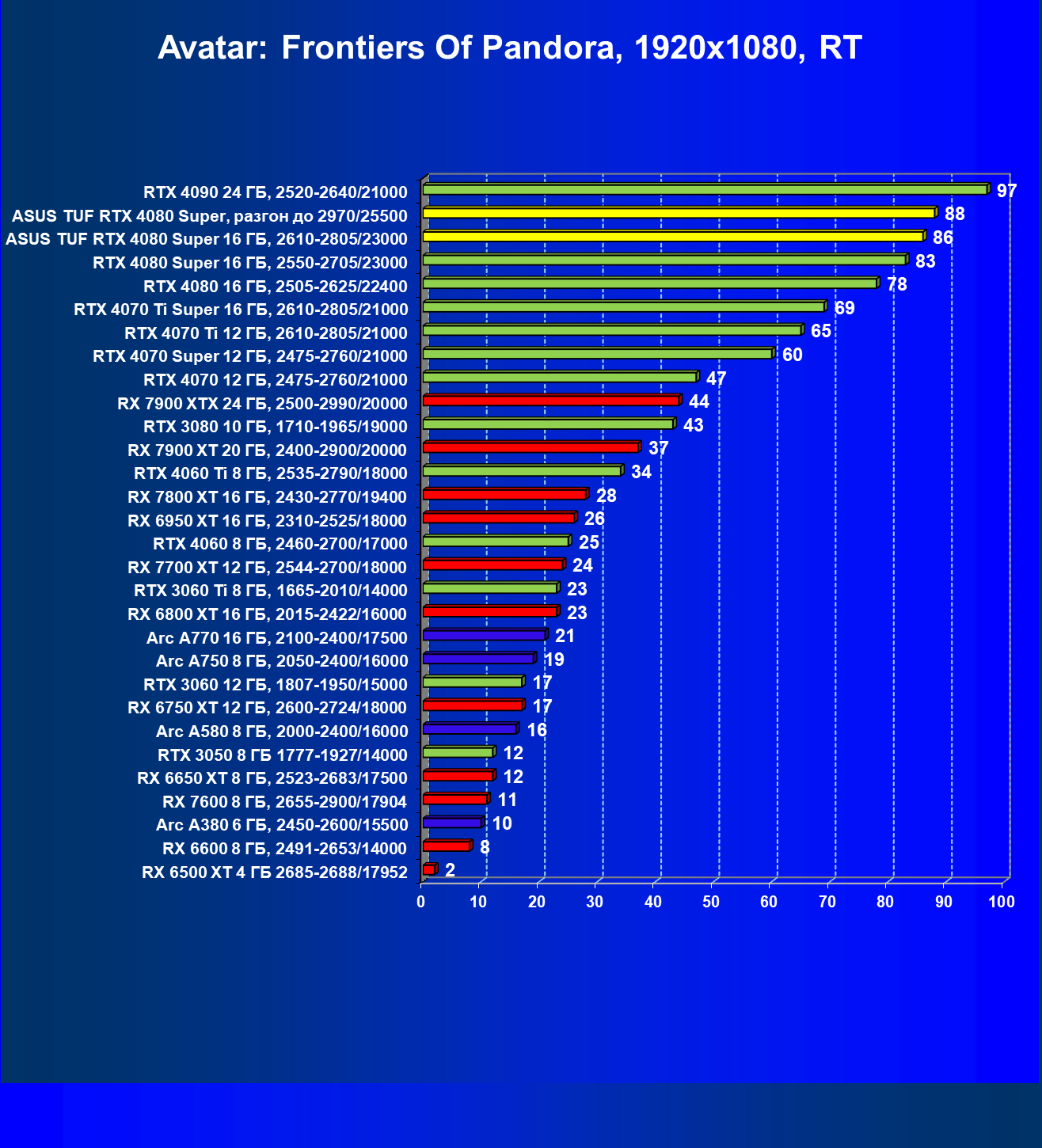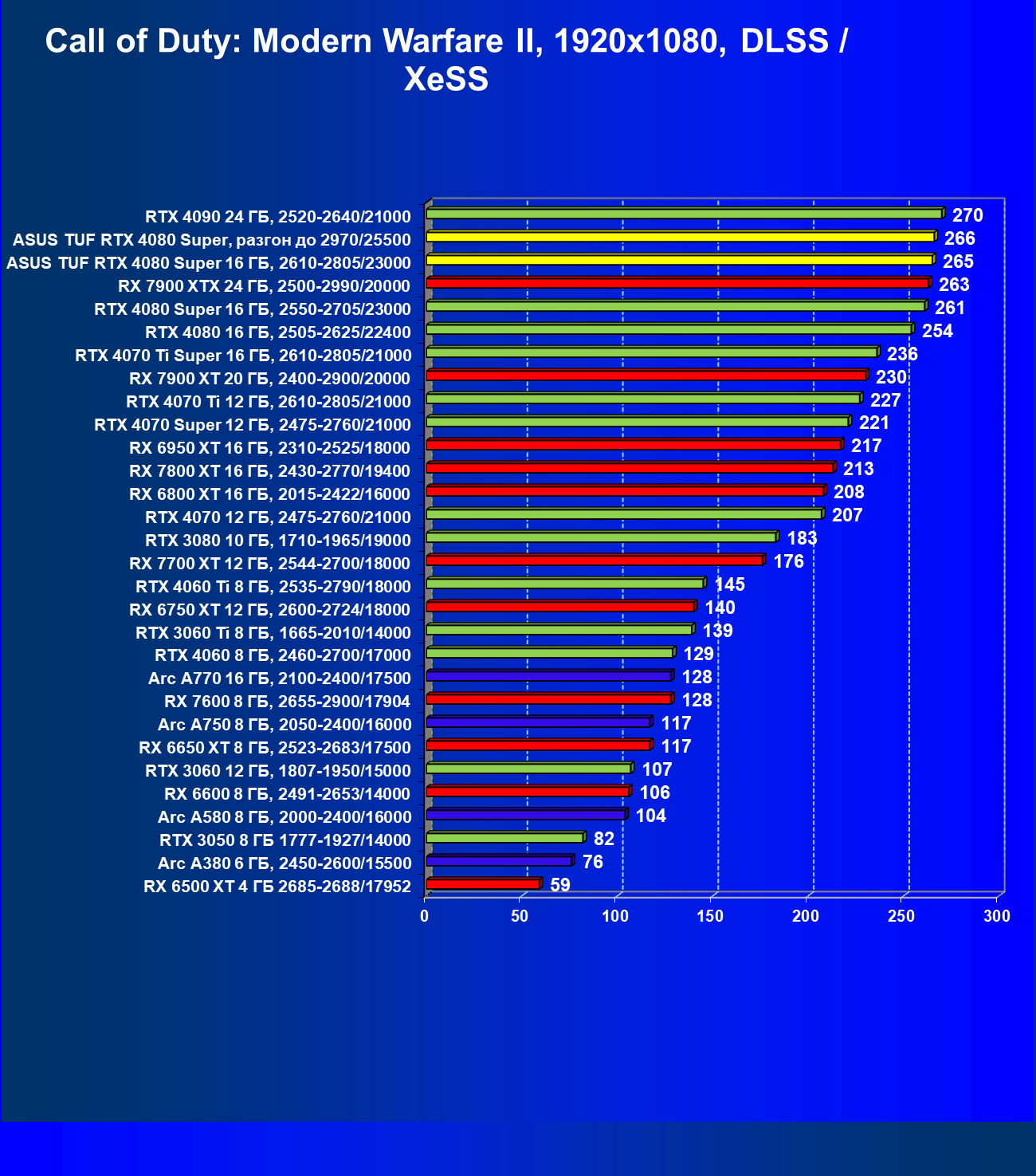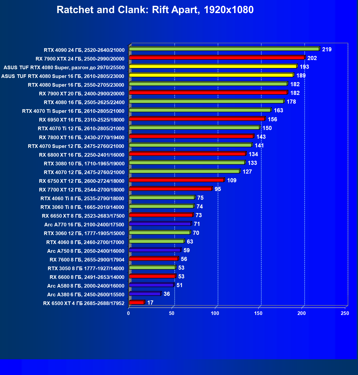 | 08 | RX 7900 XTX 24 ГБ, 2500—2990/20000 | 2163 | 219 | 99 000 |